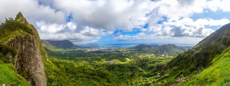 The Nu’uanu Pali Lookout, often called Pali Lookout, provides one of the most stunning panoramic views on the island of Oahu! Located only a 5-mile drive from Honolulu, this lookout is a must-visit for history buffs and nature lovers alike. It’s the perfect spot to capture breathtaking photos of Oahu with lush green mountains and sparkling blue ocean in the distance.