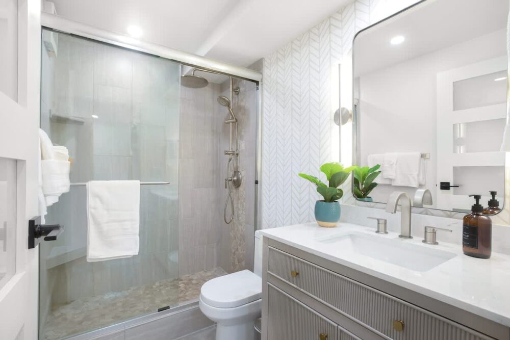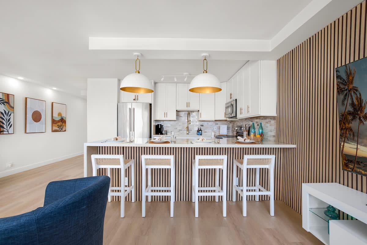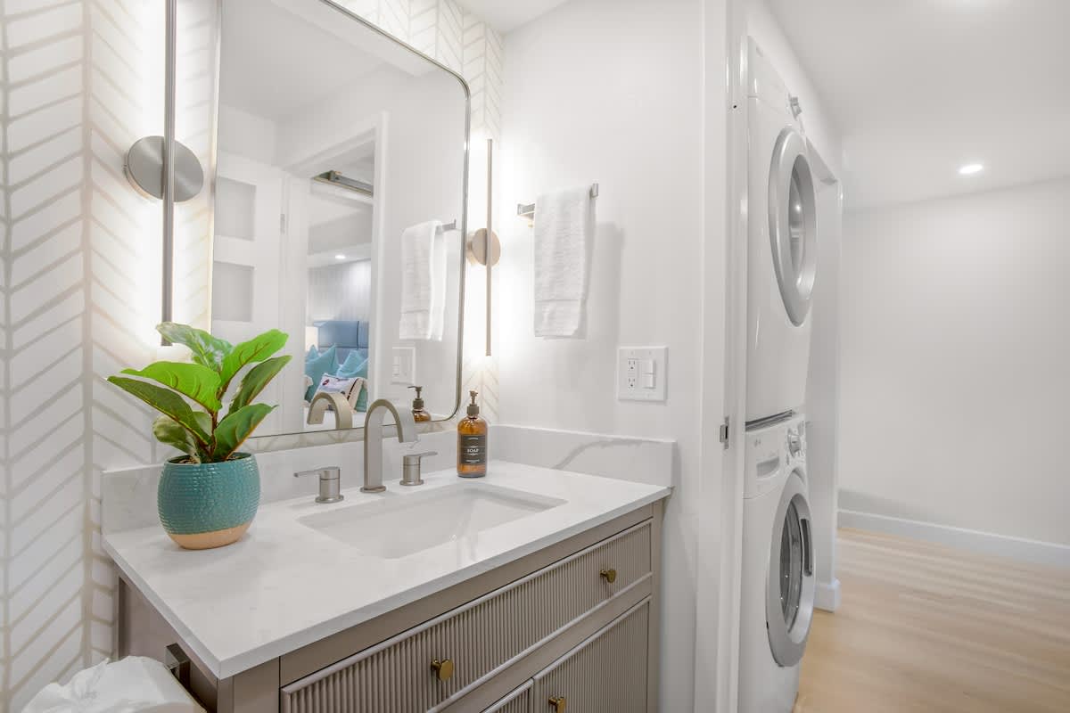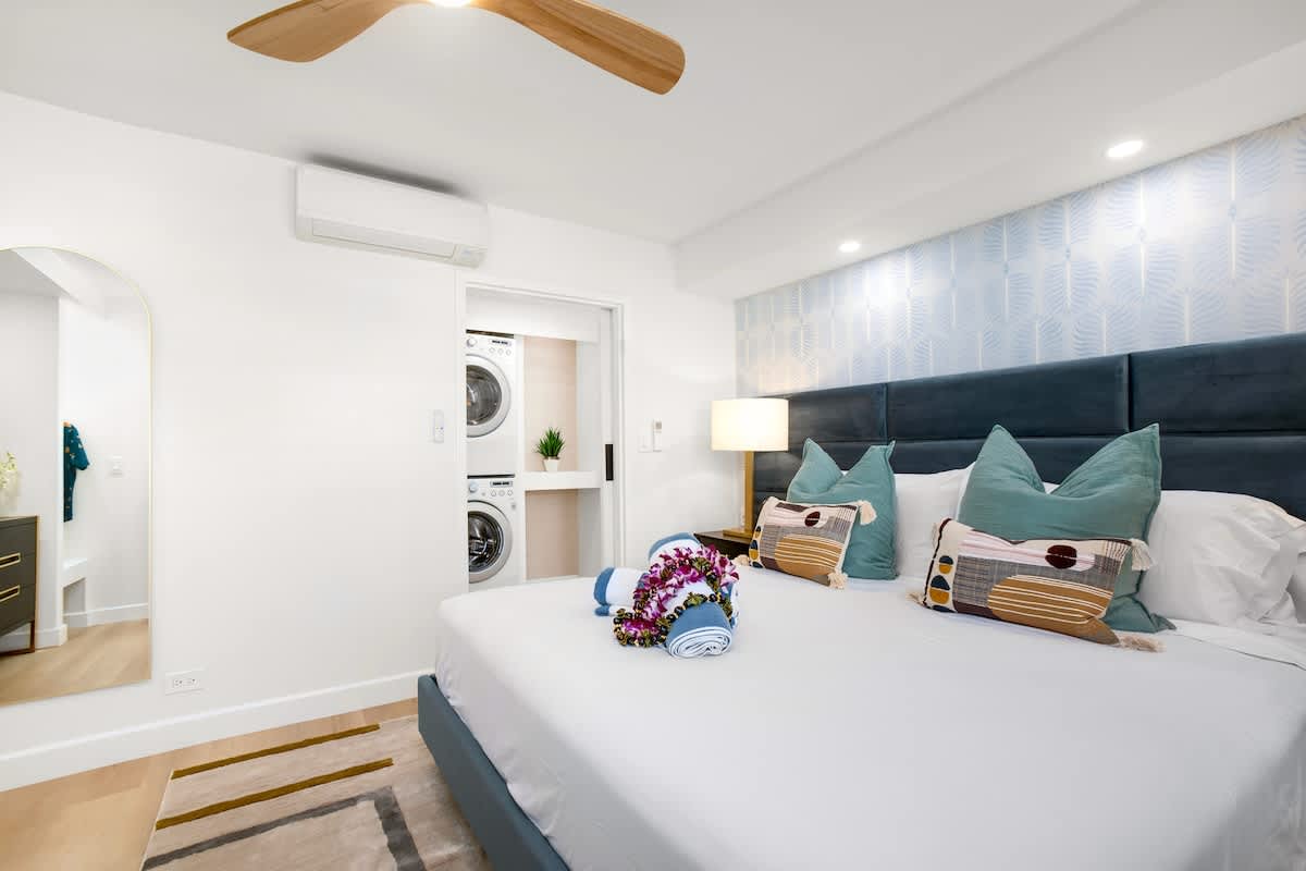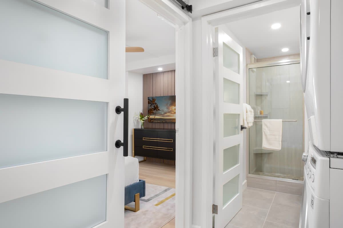 Step inside to find an open-concept living space filled with natural light and stylish upgrades. The bedroom features a luxurious king-size bed, a 50″ flat-screen TV, and split air conditioning for your comfort. The bright and airy kitchen is fully equipped with everything you need to prepare gourmet meals and flows effortlessly into the living area, which includes a queen-size sleeper sofa, a 75″ flat-screen TV, and its own split AC unit. The spa-inspired bathroom features a sleek tiled walk-in shower, while the in-unit front-loading washer and dryer add a touch of convenience.