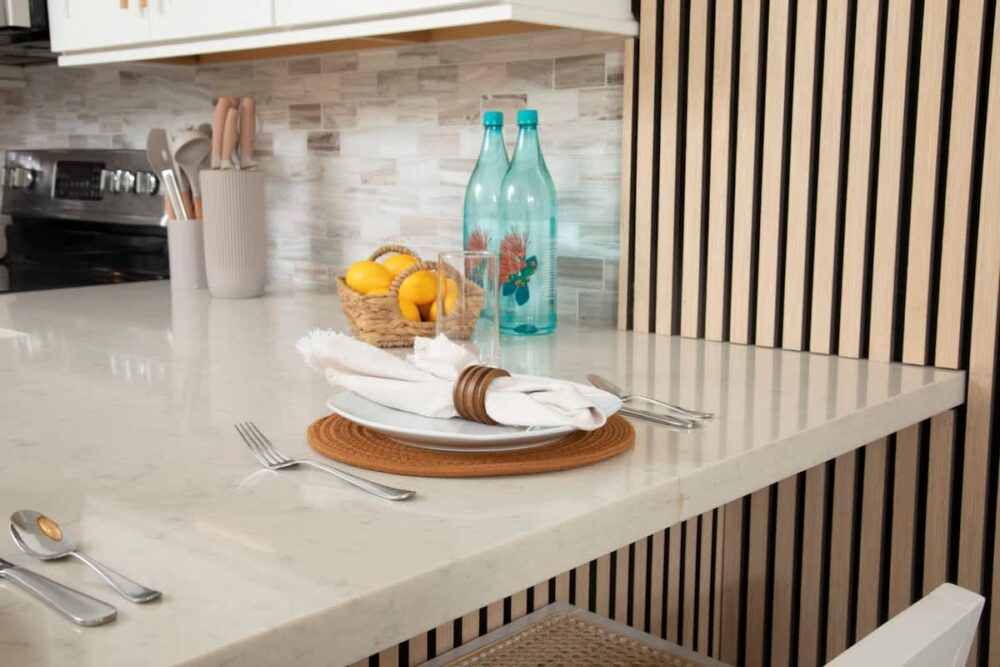 – Fully-equipped kitchen with full-size appliances: microwave/rangehood, stove, refrigerator with freezer, and dishwasher.