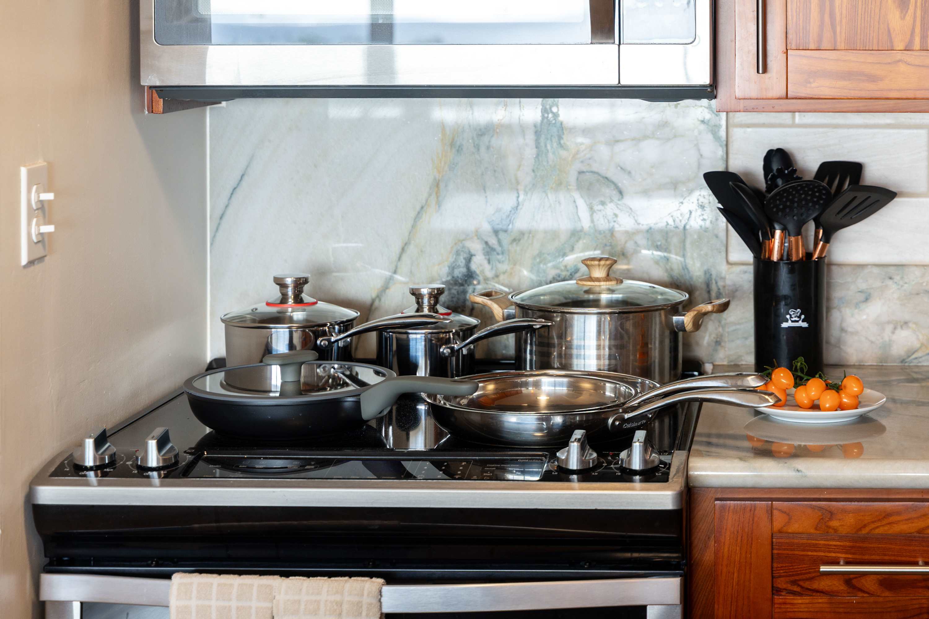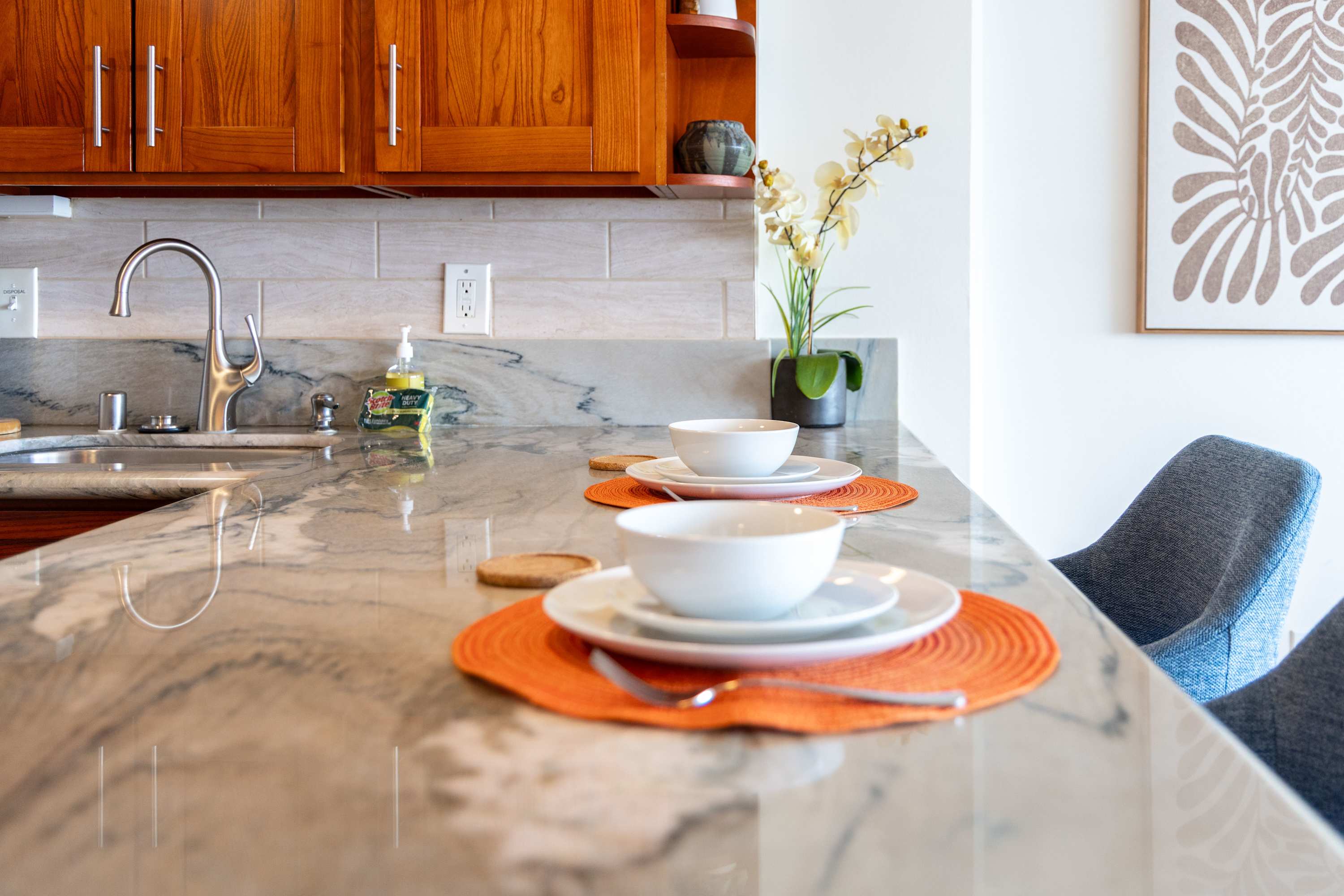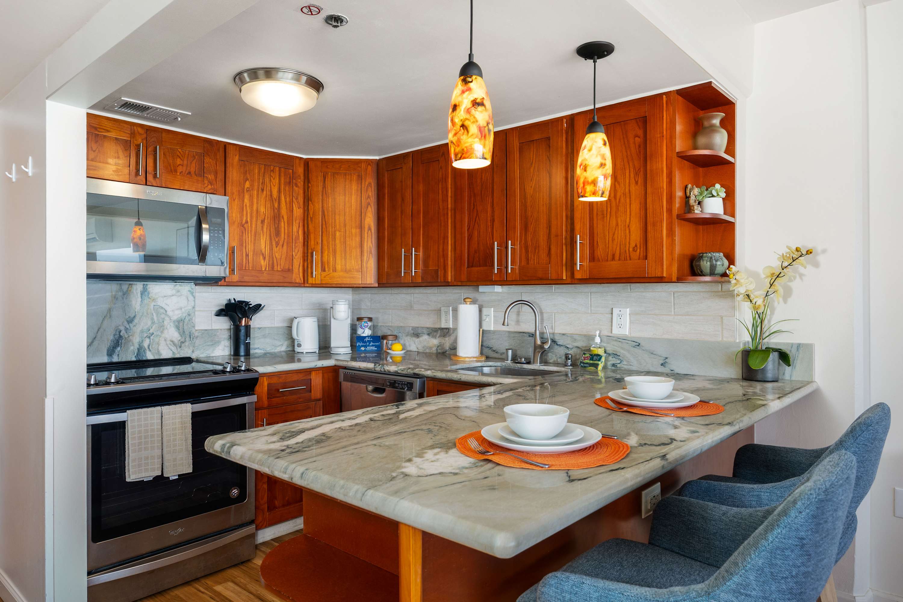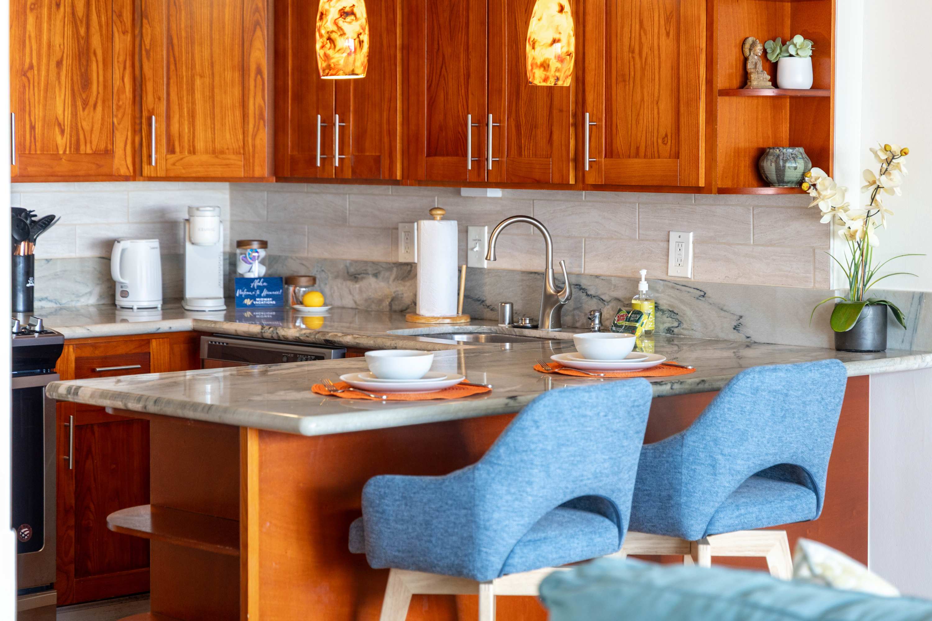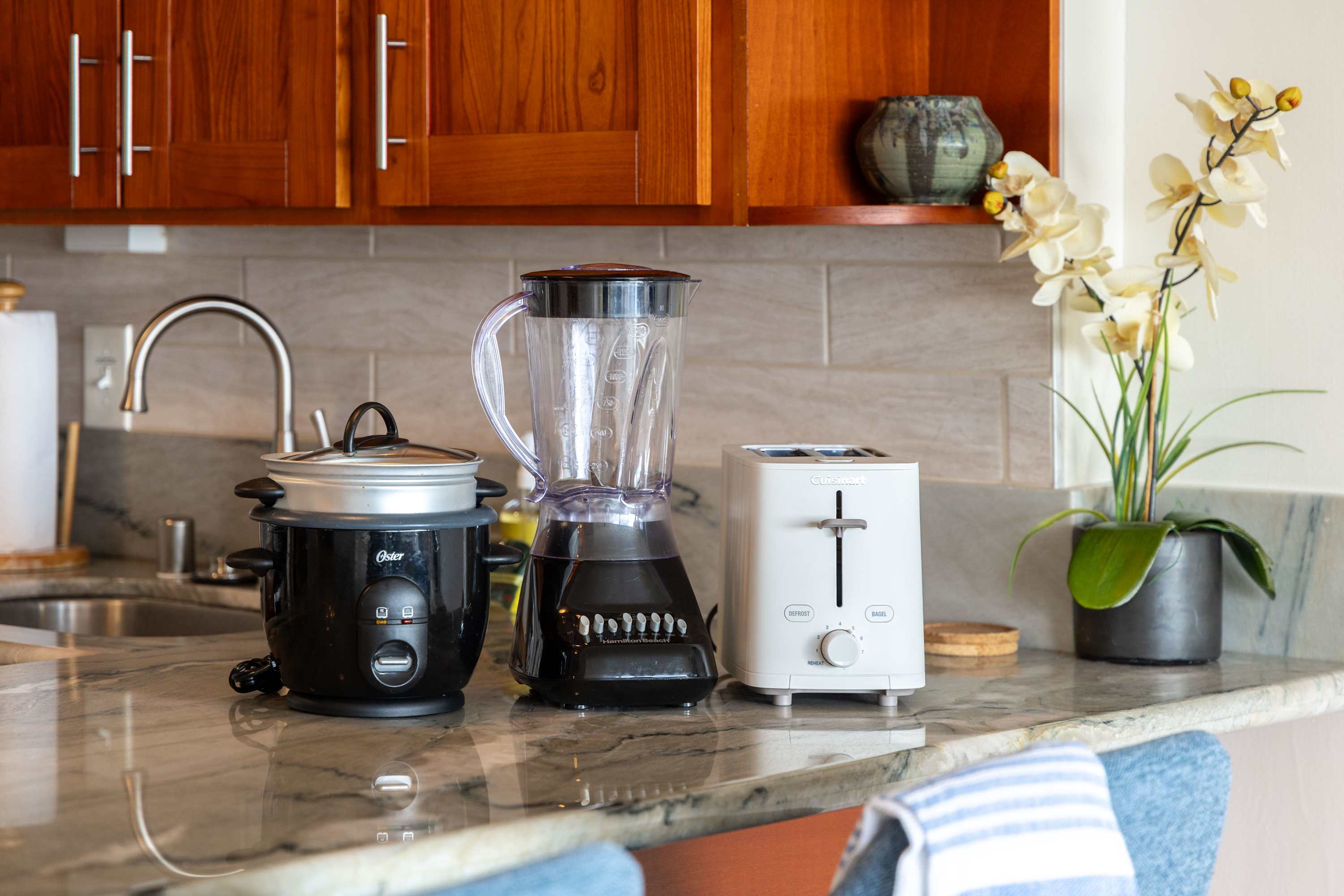 • Fully equipped with a toaster, coffee maker, rice cooker, blender, kettle, pots, pans, silverware, cookware, and dishes.