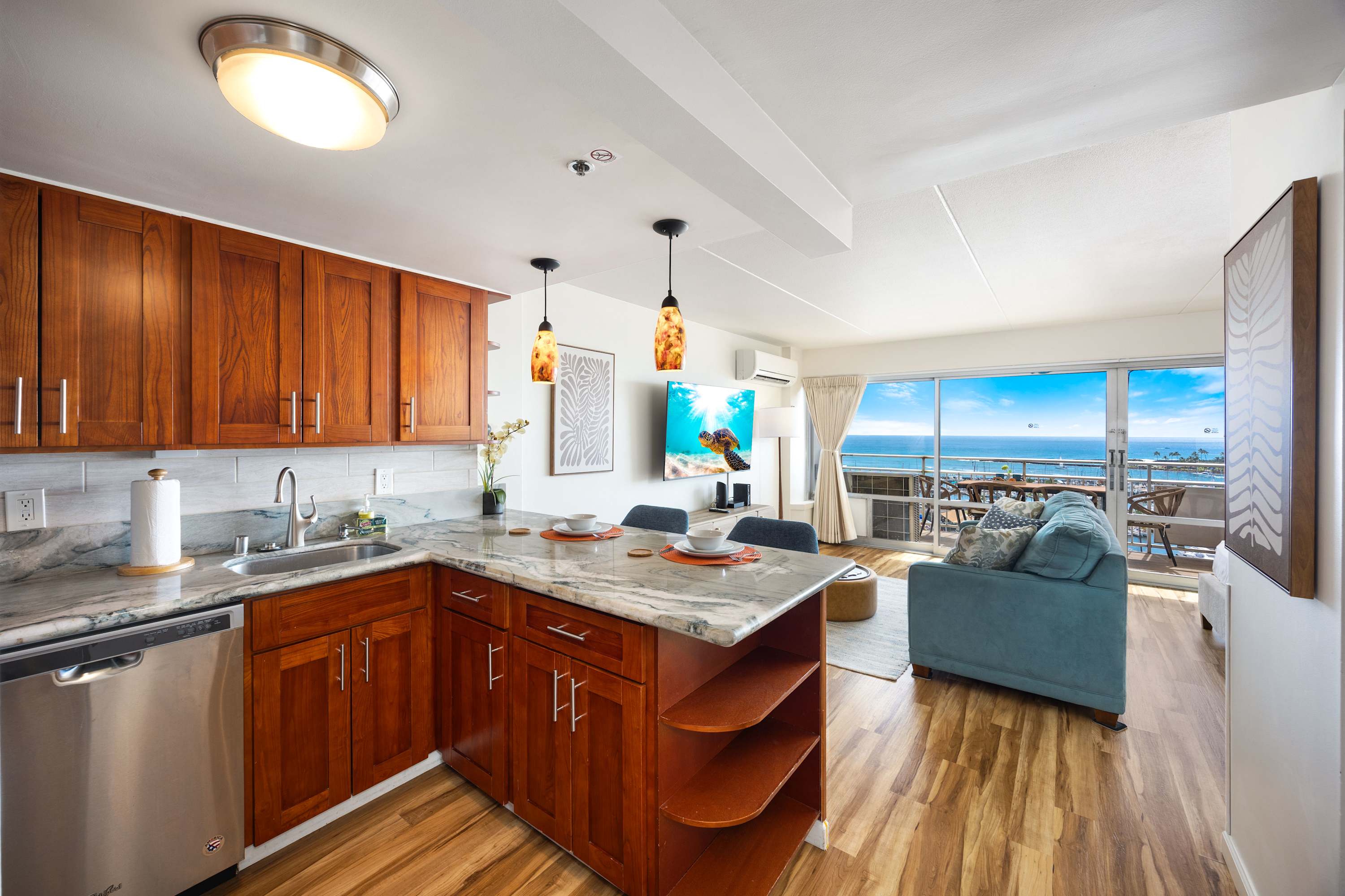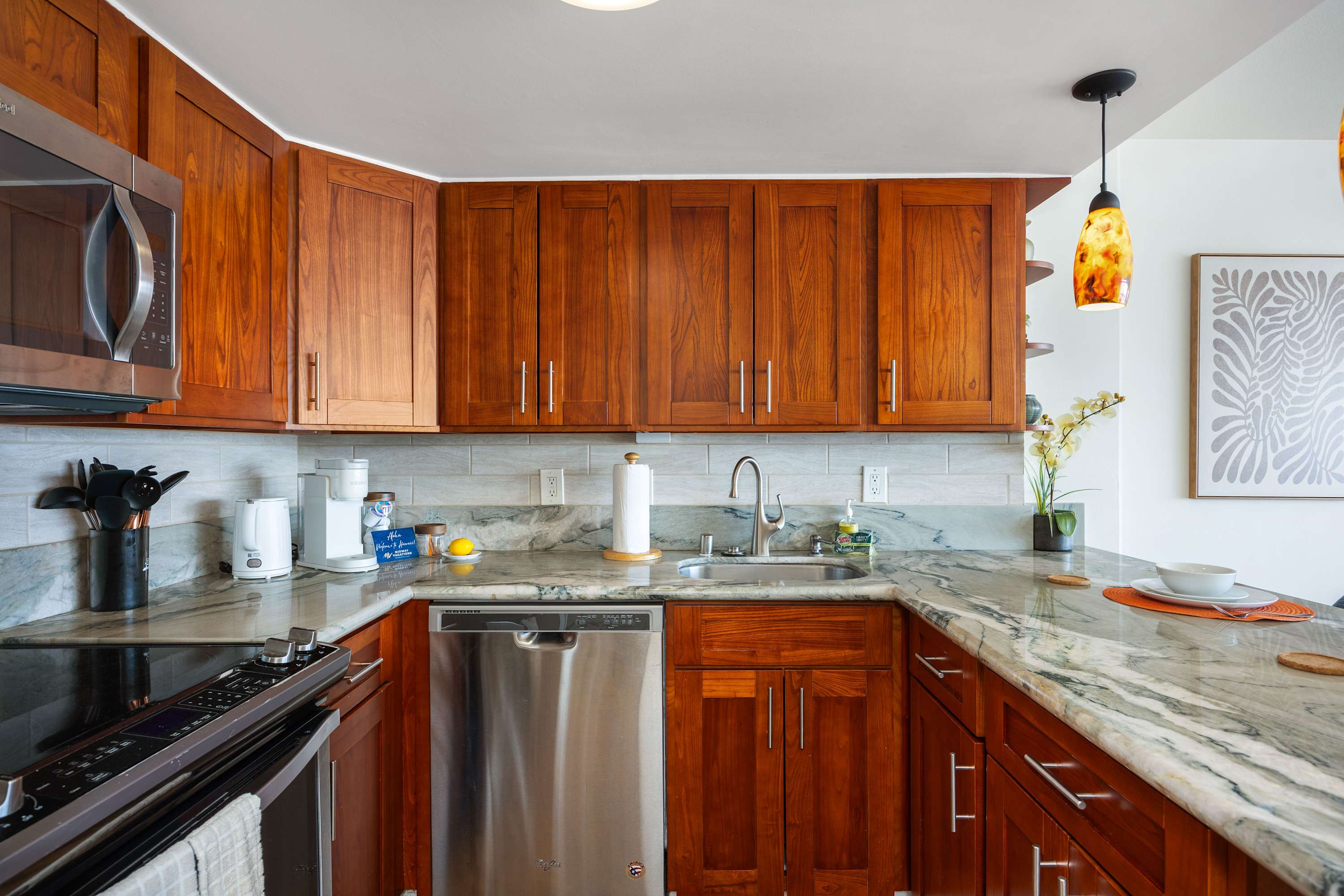 • Fully equipped kitchen with new full-size appliances: microwave, stove, refrigerator with freezer, and dishwasher.