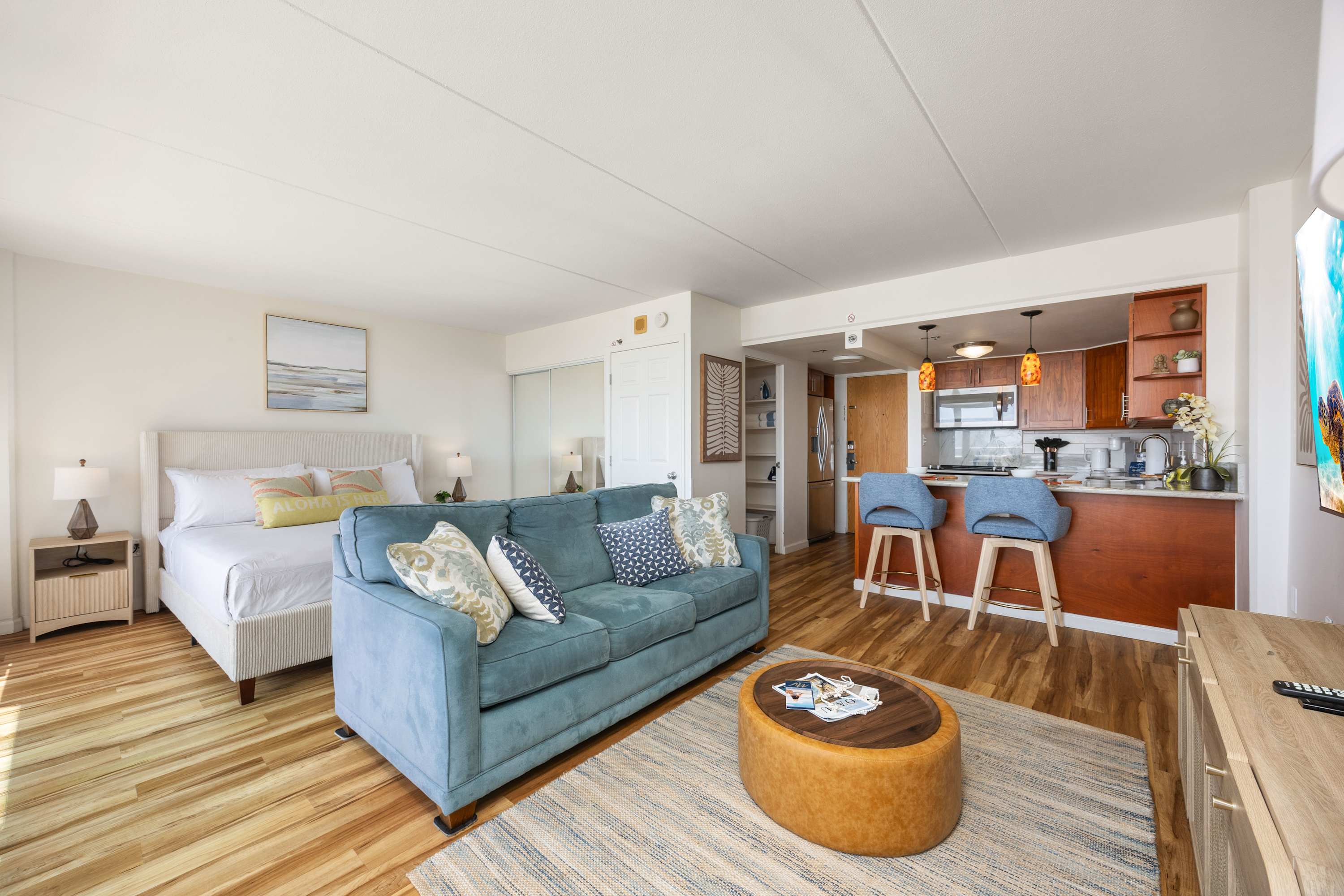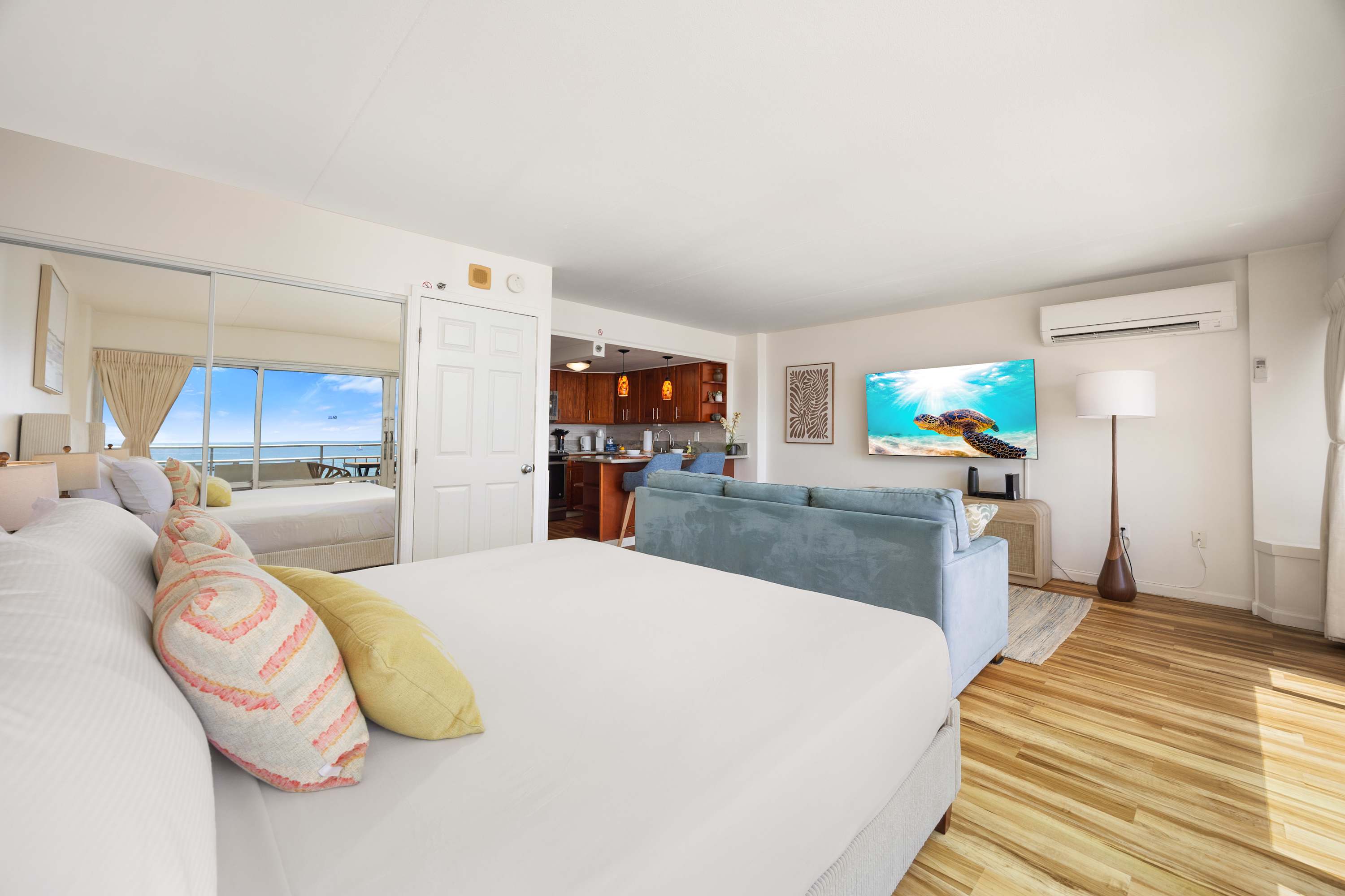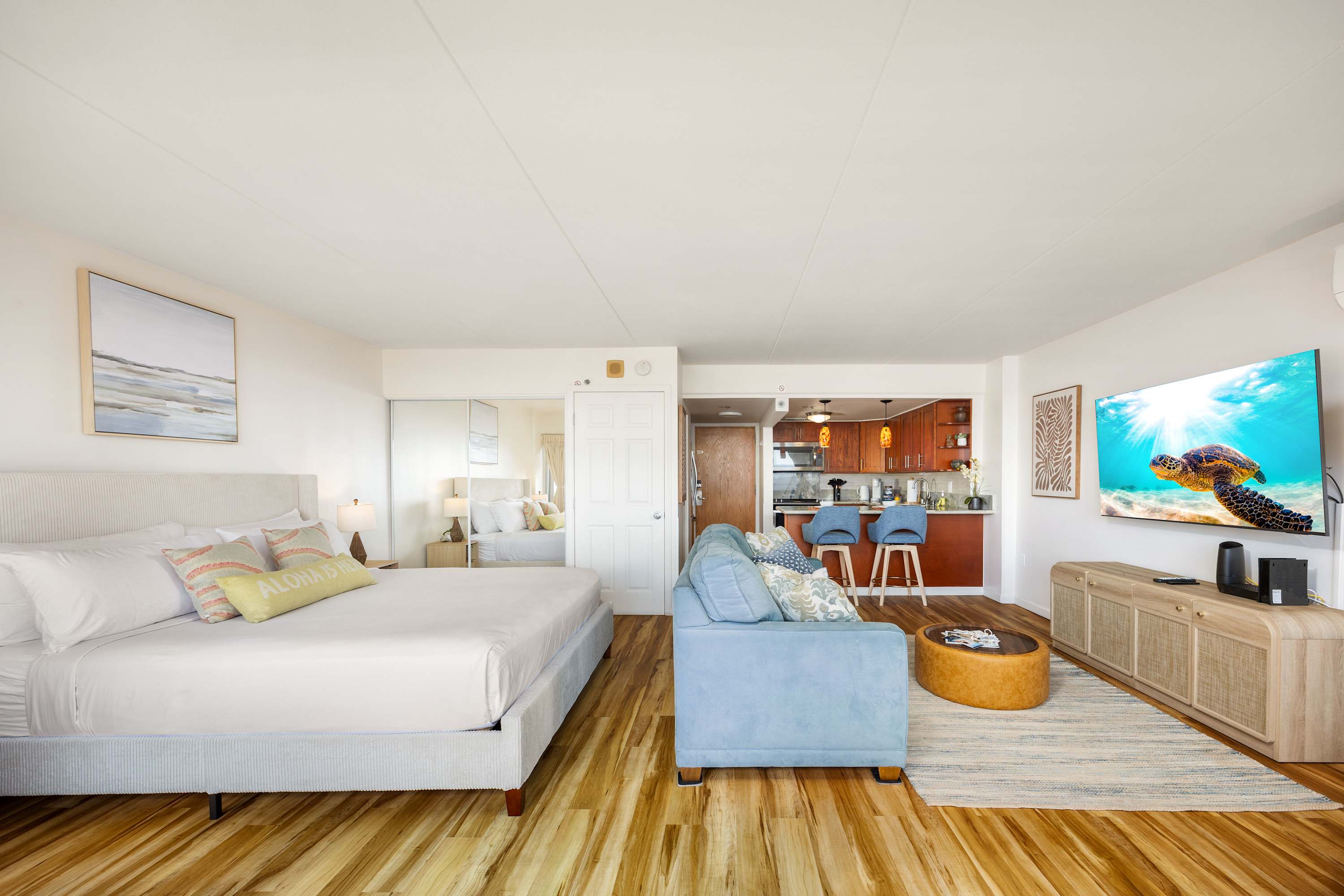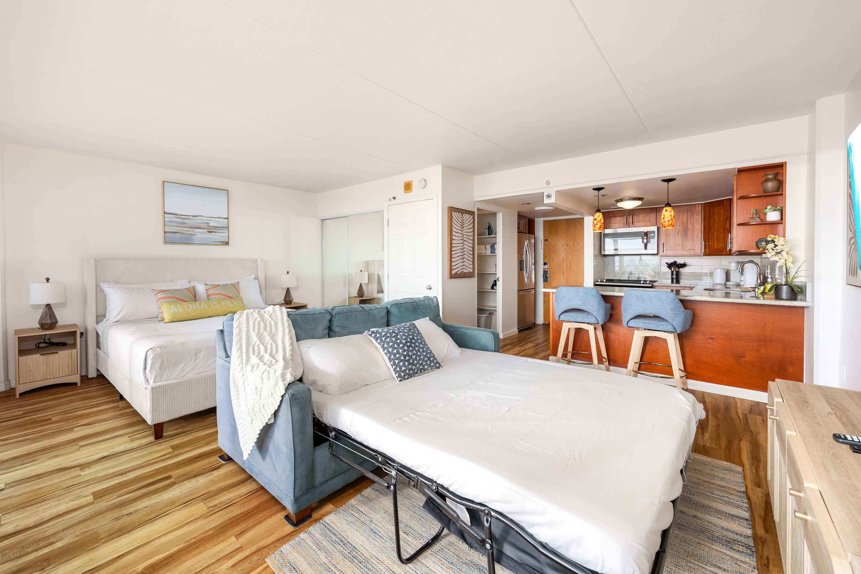 Enjoy stunning ocean and marina views from this 500 sqft 11th-floor studio at the Ilikai Hotel, ideally located at the entrance of Waikiki and just a short walk to the beach, Ala Moana Center, and top dining spots. This beautiful unit features a king bed, sleeper sofa, split AC, full kitchen, walk-in shower, and free WiFi, with valet parking available for $45/day (subject to change), making it perfect for a convenient and relaxing island stay!