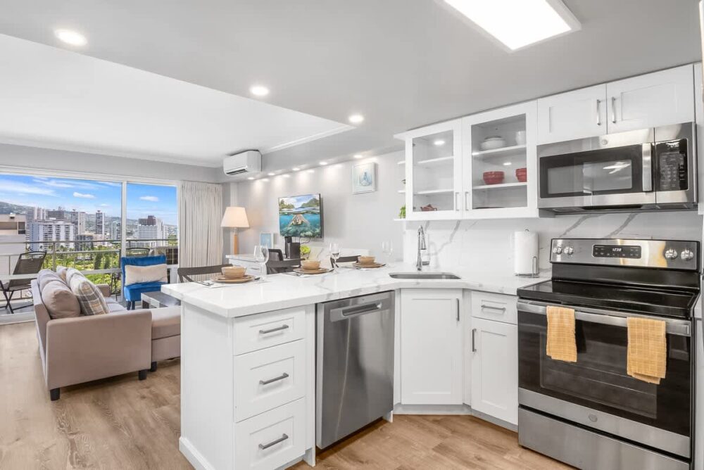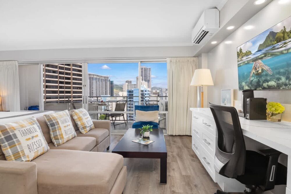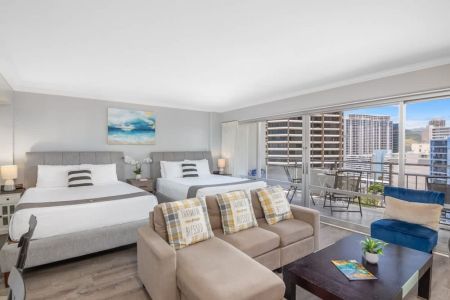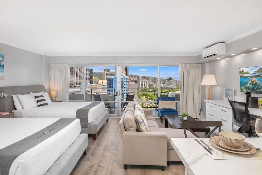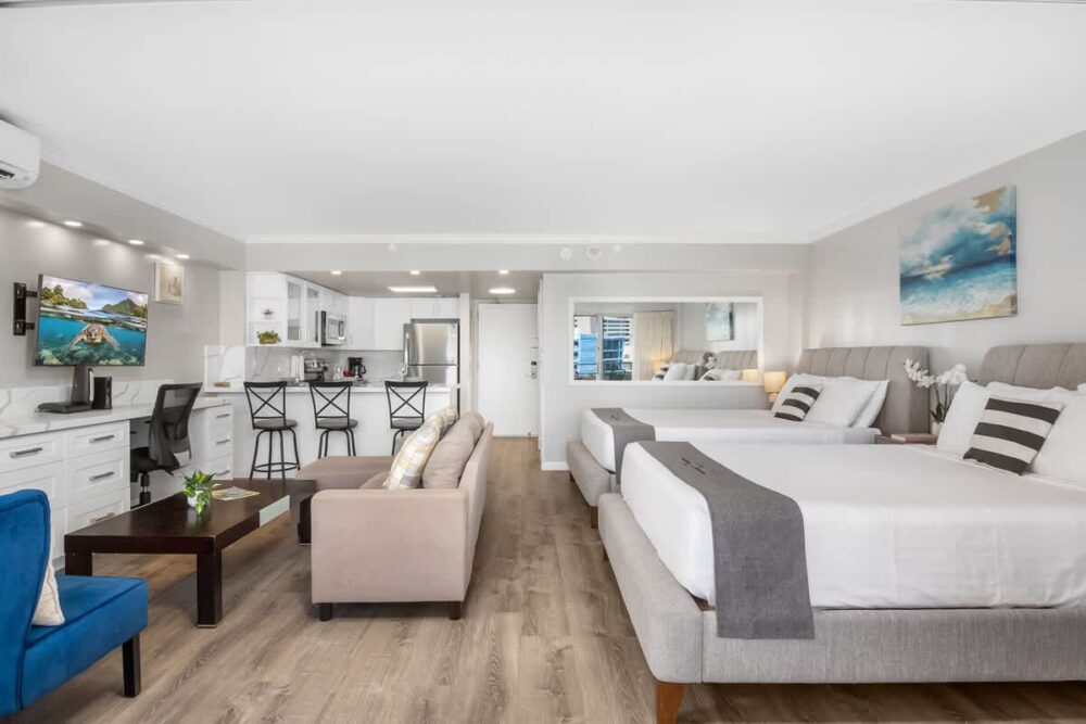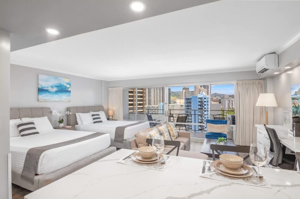 Step into this newly renovated studio condo in the iconic Ilikai Hotel and feel instantly at home. Perfect for families or friends looking to experience the bustling city of Honolulu. As you enter, you’ll be greeted with stunning city views that will take your breath away. The studio features not just one, but two queen beds for a comfortable night’s sleep. The fully equipped kitchen with full-size appliances is perfect for whipping up a delicious meal after a long day exploring the city.
