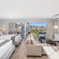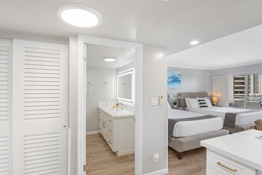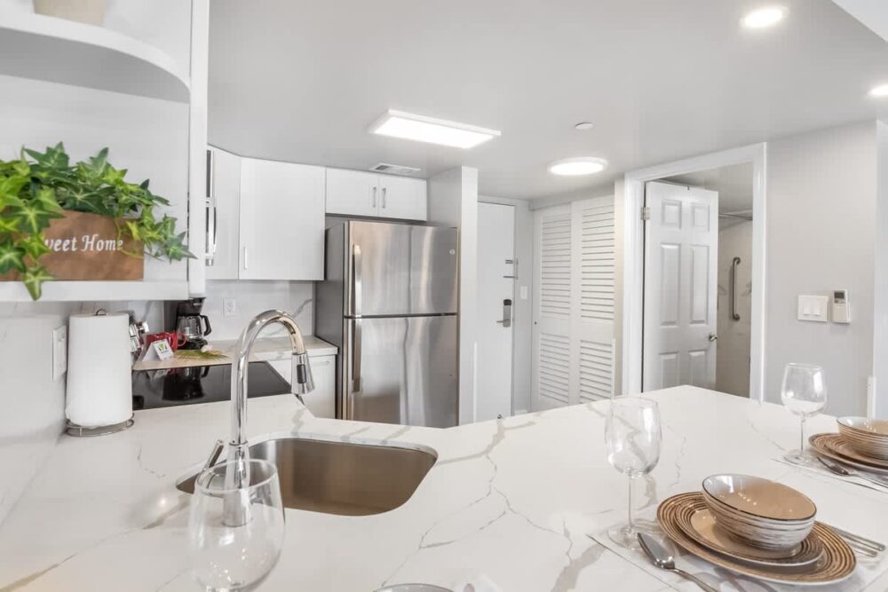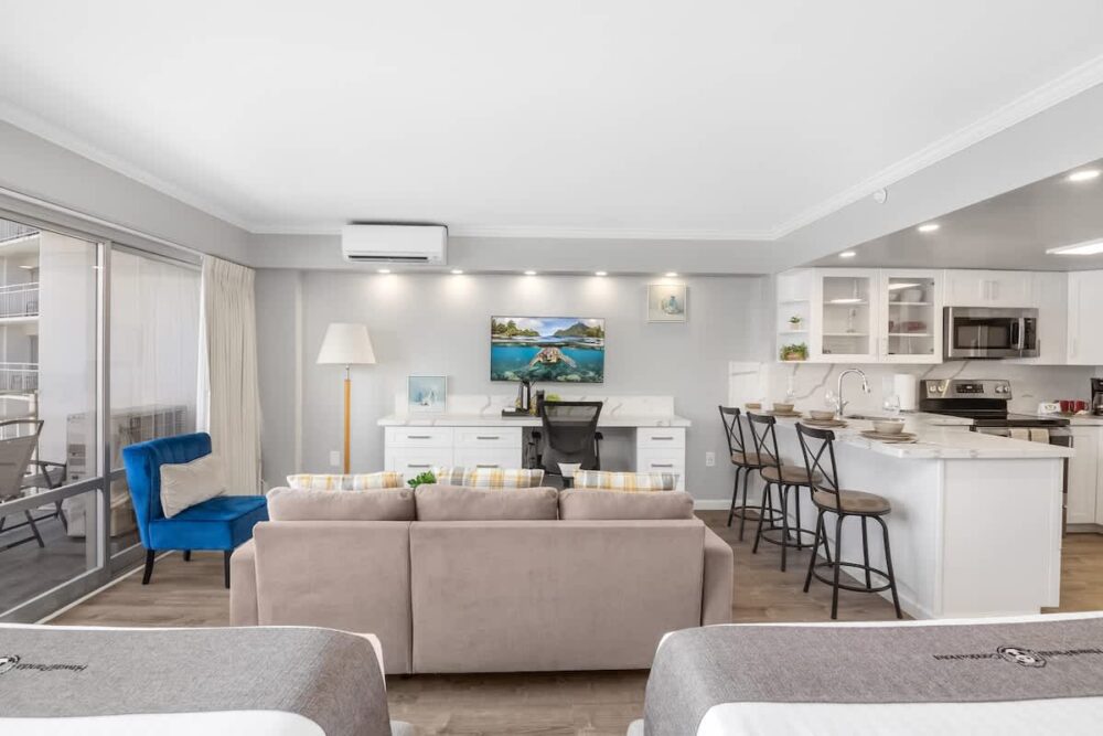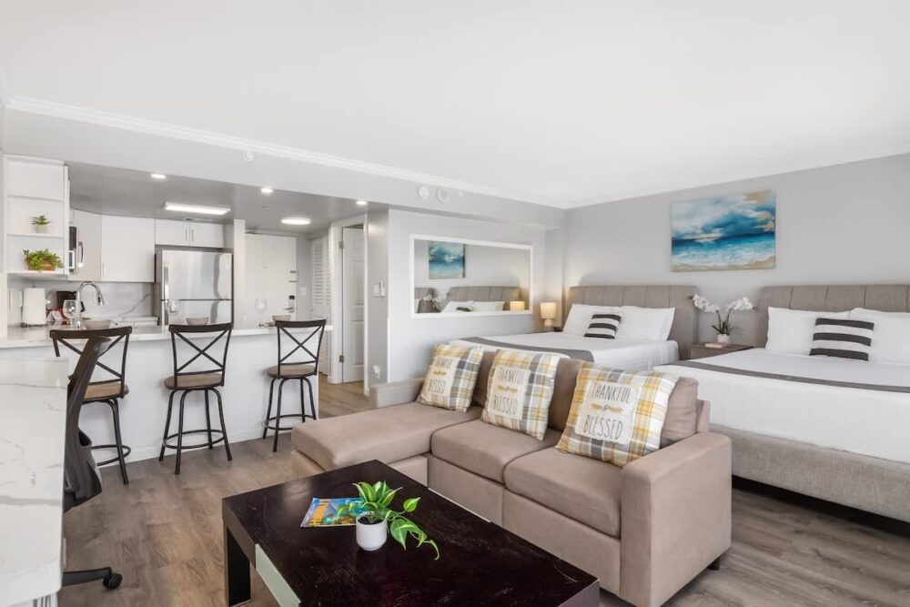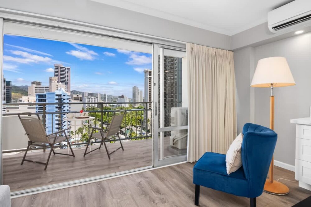 Step into this newly renovated studio condo in the iconic Ilikai Hotel and feel instantly at home. Perfect for families or friends looking to experience the bustling city of Honolulu. As you enter, you’ll be greeted with stunning city views that will take your breath away. The studio features not just one, but two queen beds for a comfortable night’s sleep. The fully equipped kitchen with full-size appliances is perfect for whipping up a delicious meal after a long day exploring the city.
