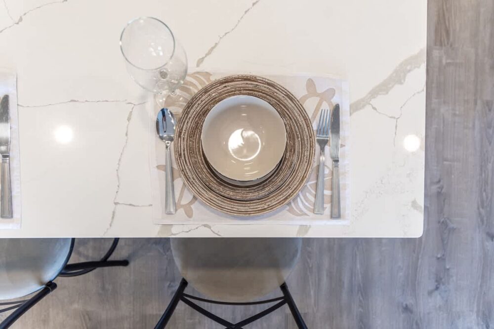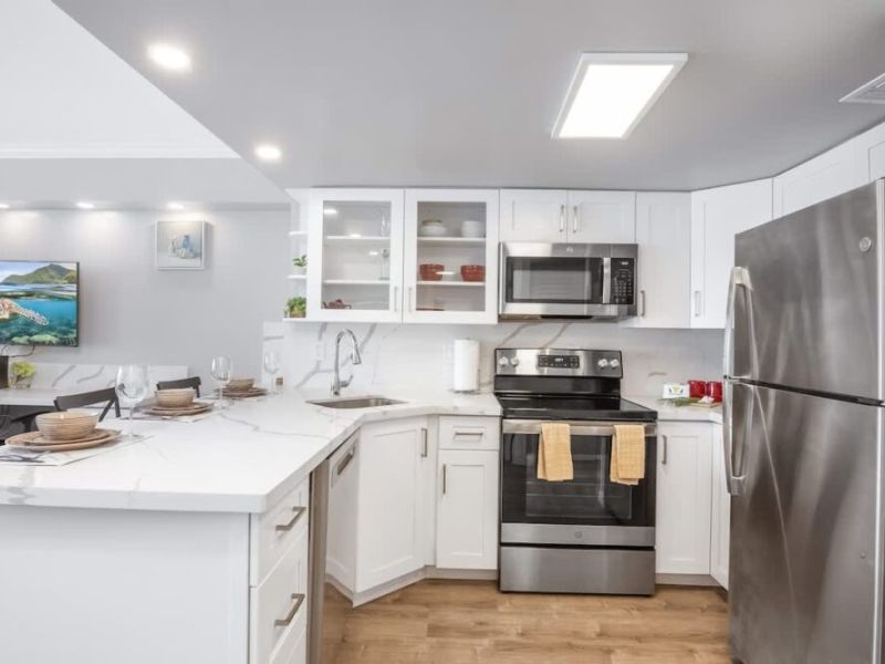 – Fully equipped kitchen with new full-size appliances: microwave, stove, refrigerator with freezer, and dishwasher.