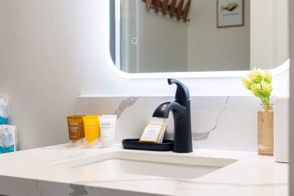 – Start-up supplies: coffee filters, Welcome coffee pack, salt & pepper, laundry detergent, dish soap, sponge, hand soap, welcome set of shampoo, body wash and body lotion, toilet paper, paper towels, tissue, and basic cleaning supplies.