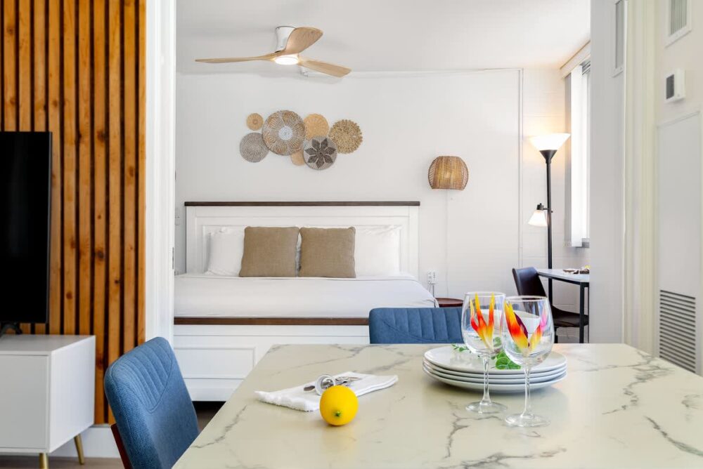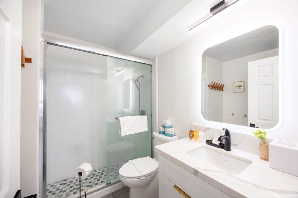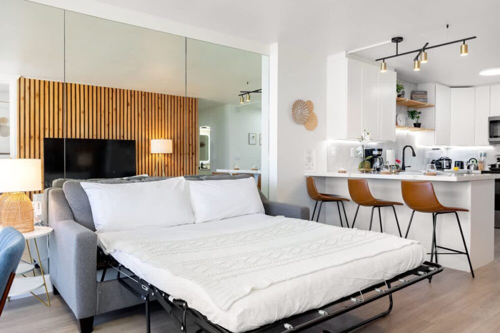 Inside, the unit offers a perfect blend of comfort and style. The living room is a cozy space to unwind, complete with a dining table for four and a sleeper sofa where you can relax and enjoy your favorite shows on the 65-inch TV. The fully equipped kitchen, with full-size appliances, invites you to prepare delicious meals with ease. The bedroom features a luxurious king-size bed, providing a serene sanctuary for restful nights and a dedicated workspace, while the full bathroom is designed with a walk-in shower to refresh and rejuvenate.