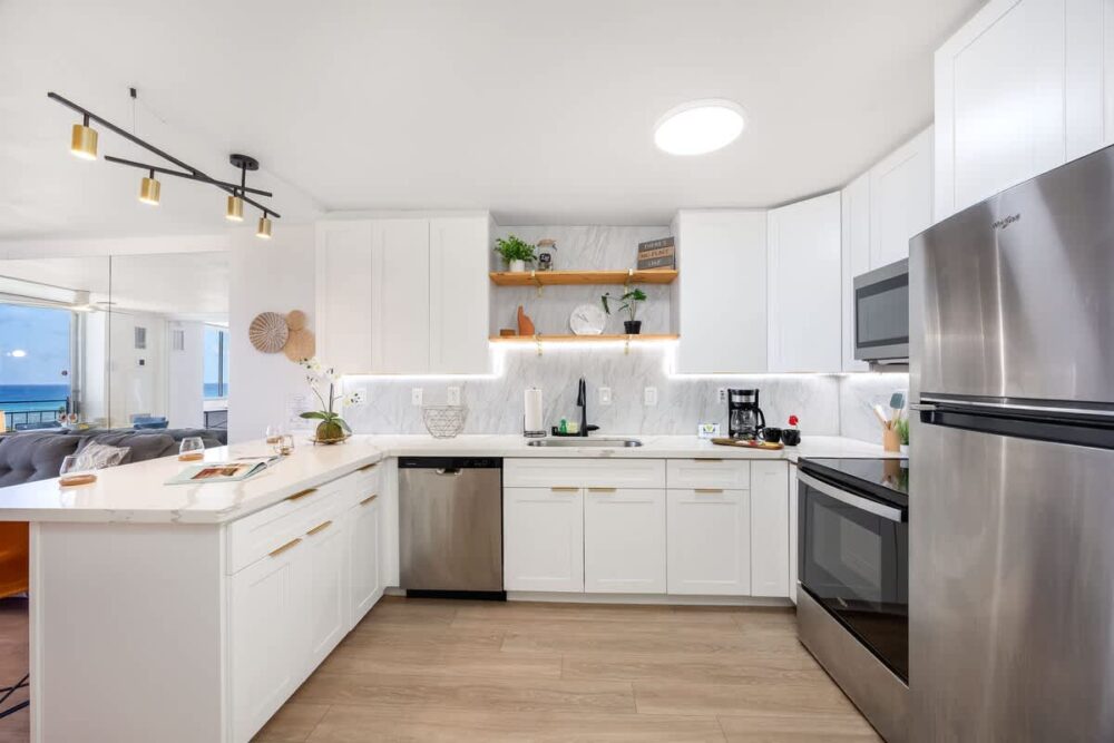 – Fully equipped kitchen with new full-size appliances: microwave, stove, refrigerator with freezer, and dishwasher