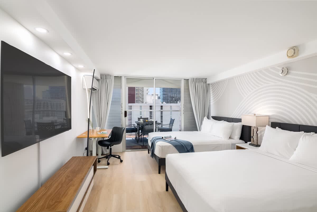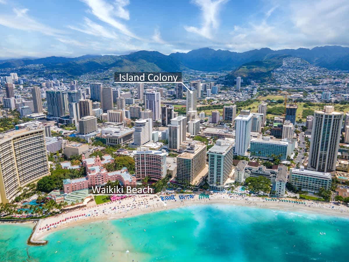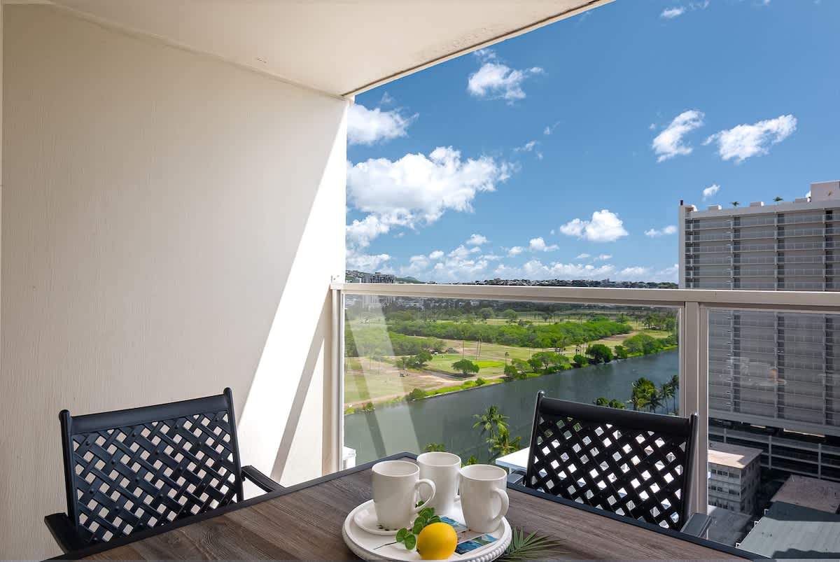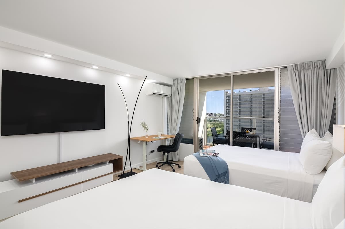 Discover this newly renovated studio with Ala Wai Canal view, split AC, and 2 Queen beds at Island Colony!