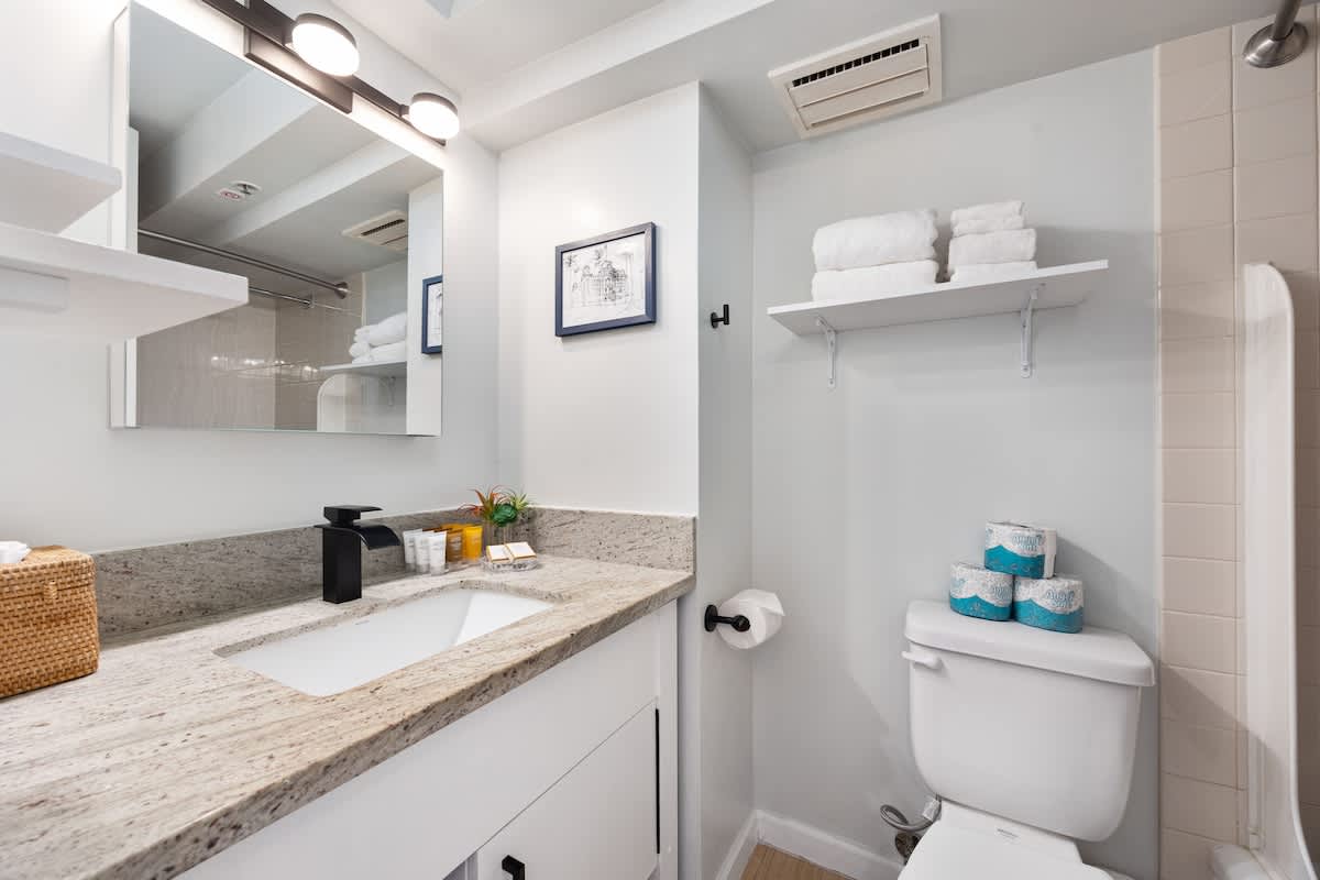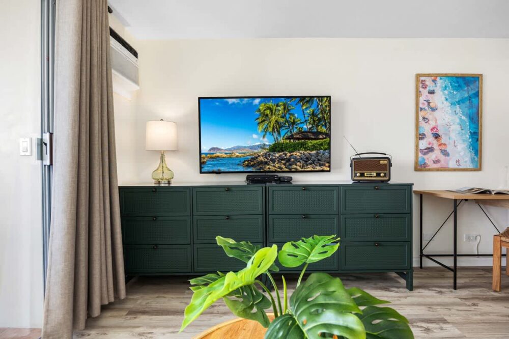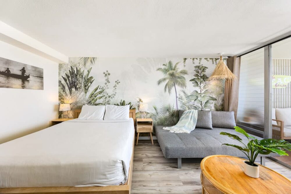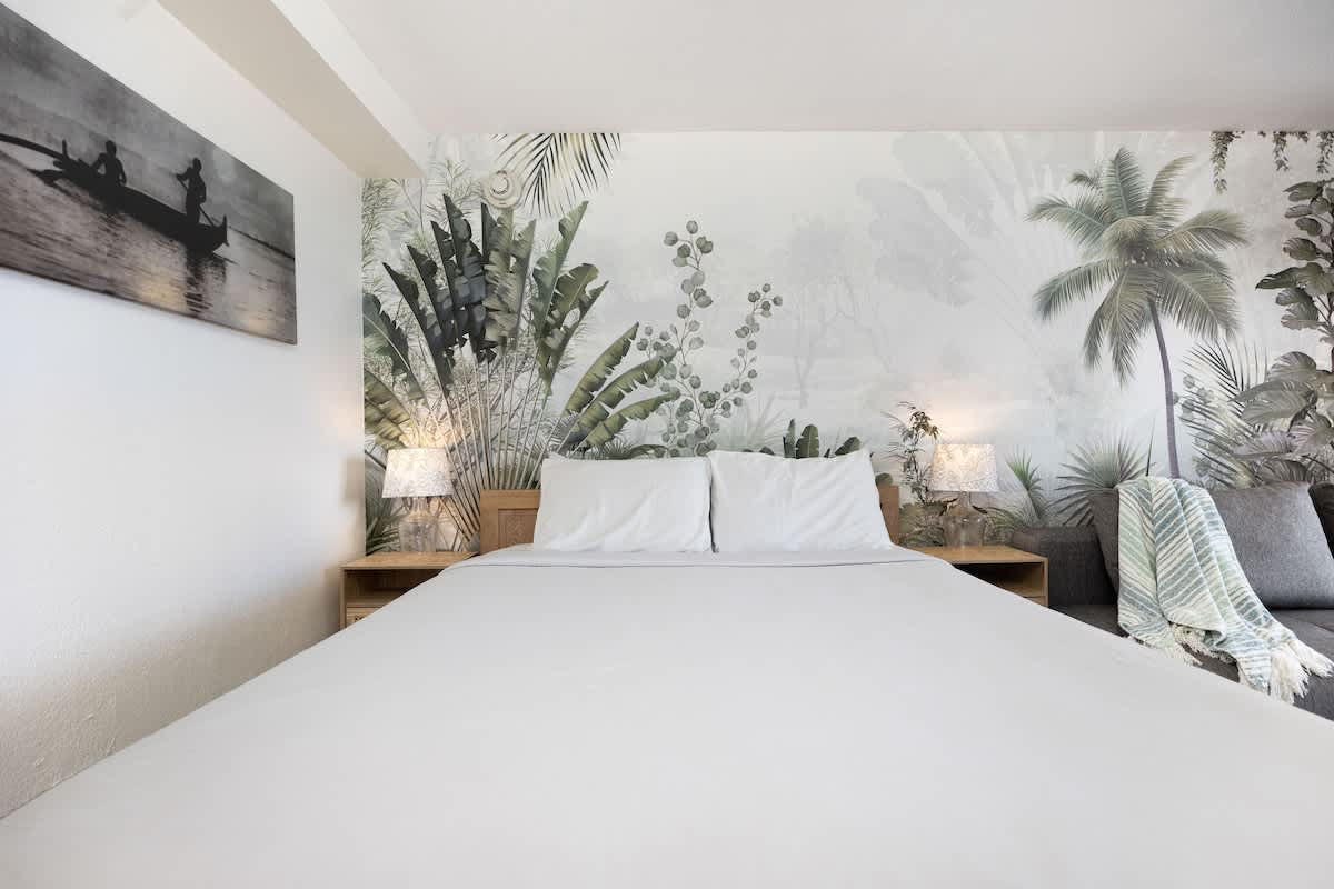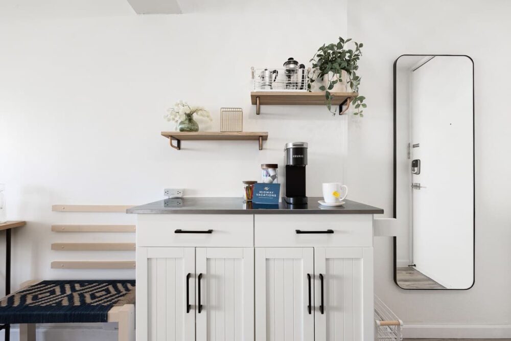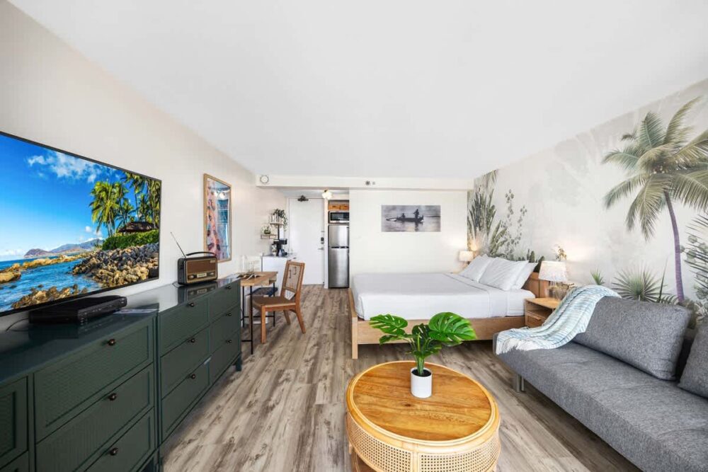 Designed with comfort and convenience in mind, this airy studio features an open floor plan with air conditioning, a queen-size bed, a futon sofa, and a 55” Smart TV. The well-appointed kitchenette includes a 2-burner stovetop, microwave, full-size refrigerator with freezer, Keurig coffee maker, cookware, dishwasher, dishes, and utensils—everything you need for a relaxed stay. Stay connected with high-speed Wi-Fi and cable TV throughout your visit.