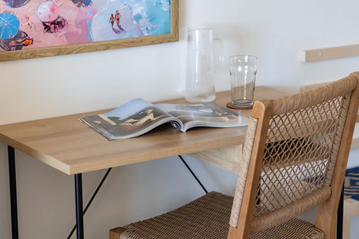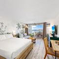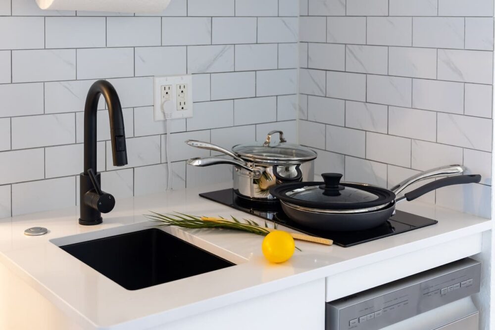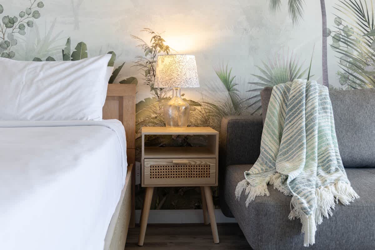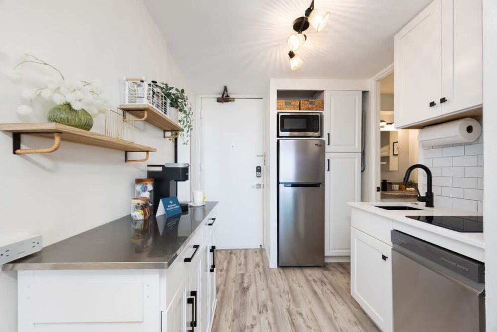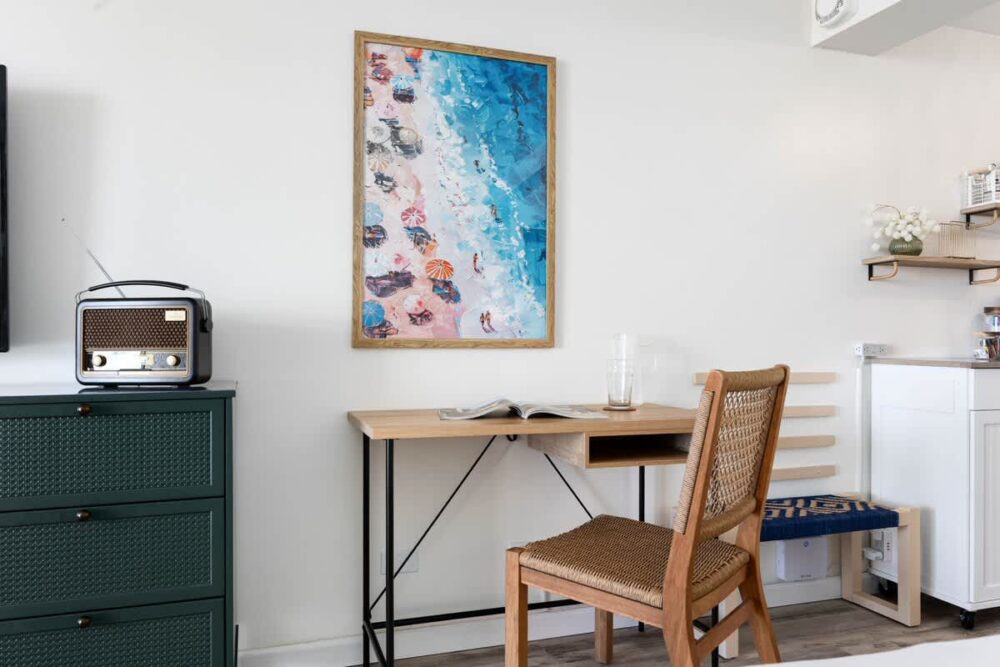 Designed with comfort and convenience in mind, this airy studio features an open floor plan with air conditioning, a queen-size bed, a futon sofa, and a 55” Smart TV. The well-appointed kitchenette includes a 2-burner stovetop, microwave, full-size refrigerator with freezer, Keurig coffee maker, cookware, dishwasher, dishes, and utensils—everything you need for a relaxed stay. Stay connected with high-speed Wi-Fi and cable TV throughout your visit.