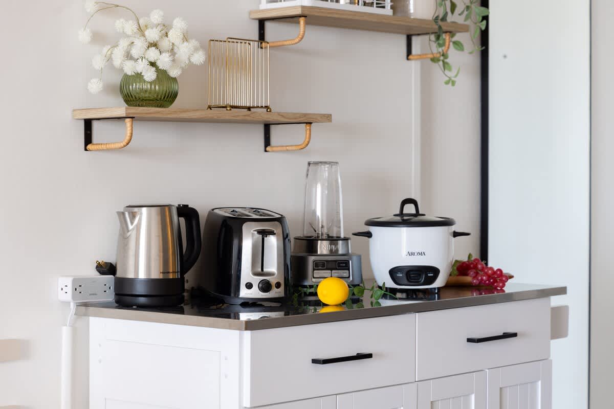 – Equipped with toaster, Keurig coffee maker, blender, kettle, silverware, cookware, dishes and utensils.