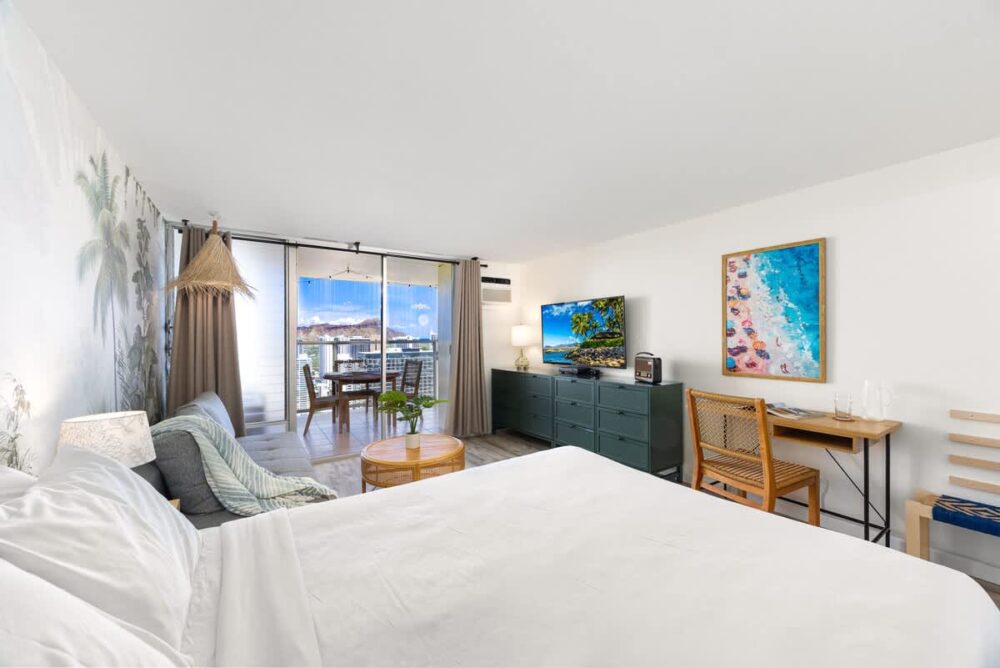 Welcome to this beautifully renovated studio on the 42nd floor of Island Colony, where sweeping views of the sparkling ocean and iconic Diamond Head create the perfect backdrop for your stay. Thoughtfully designed for comfort and charm, this cozy retreat is ideal for two guests seeking a serene escape in the heart of Waikiki. For added convenience, on-site parking is available for $45 per day (rates subject to change without prior notice).