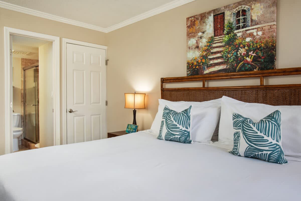 Inside, you’ll find a welcoming space designed for both comfort and convenience. The fully equipped kitchen makes it easy to whip up delicious meals with fresh island ingredients, while the dining area seats 4 and offers the perfect spot to gather and share good food and great company. The living room features a comfy sleeper sofa and a 65″ Smart TV — ideal for relaxing after a day of exploring. The bedroom is your private retreat with a portable AC, a 32″ Cable TV, and a plush king-sized bed for a restful night. The 2 bathrooms feature a walk-in shower, and the unit also includes air conditioning, free Wi-Fi, a washer and dryer, and free parking to make your stay as easy as possible.