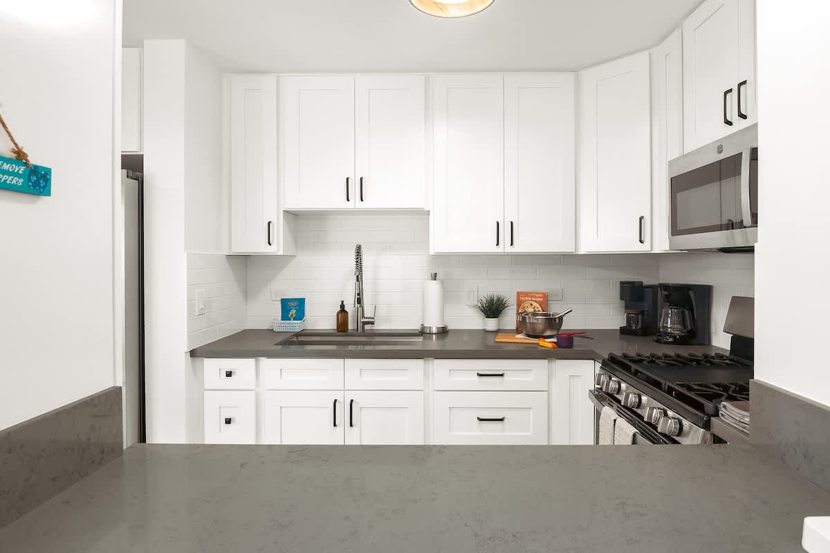 We provide a welcome starter supply kit stocked with – one pack of coffee grounds, coffee filters, toilet paper, paper towel, tissue, can liners, salt & pepper, spray oil, laundry detergent, dish soap, sponge, hand soap, shampoo, conditioner, body wash, body lotion, and bar soap. Please note that this is only a starter supply to make sure you have everything you need upon arrival.