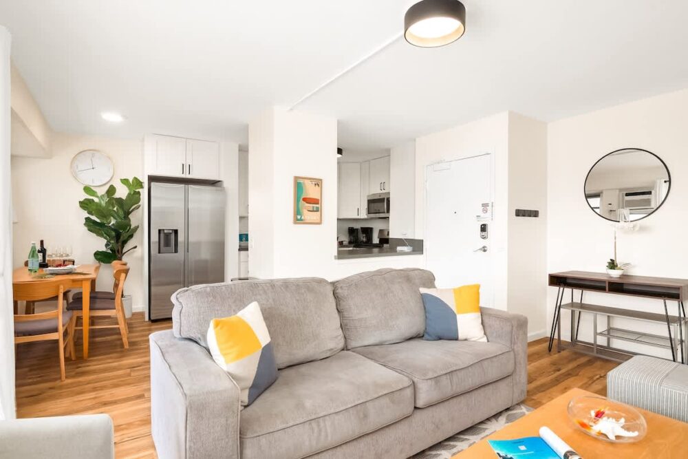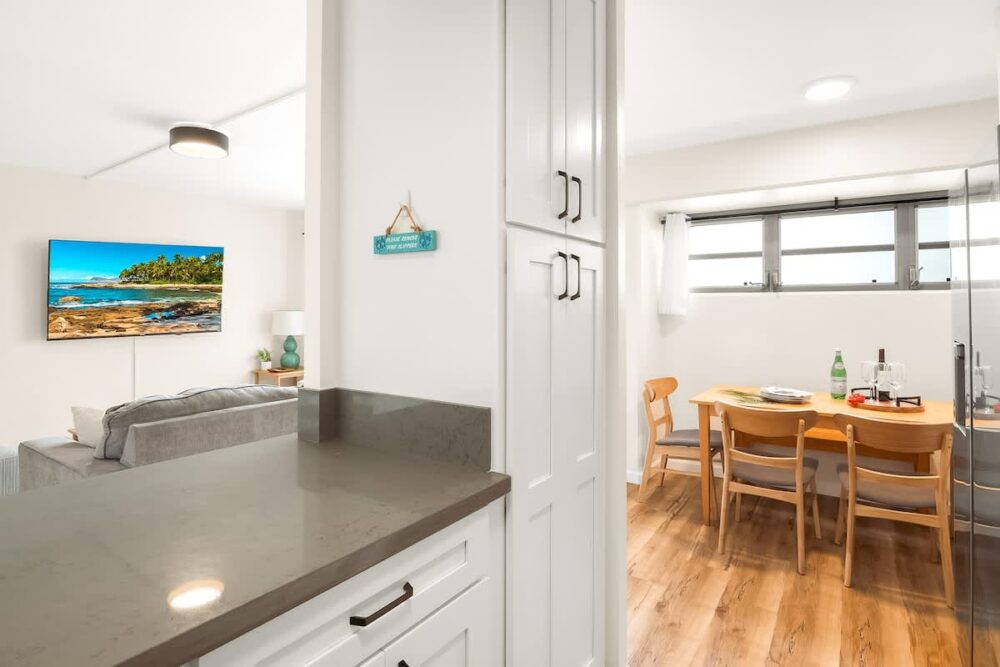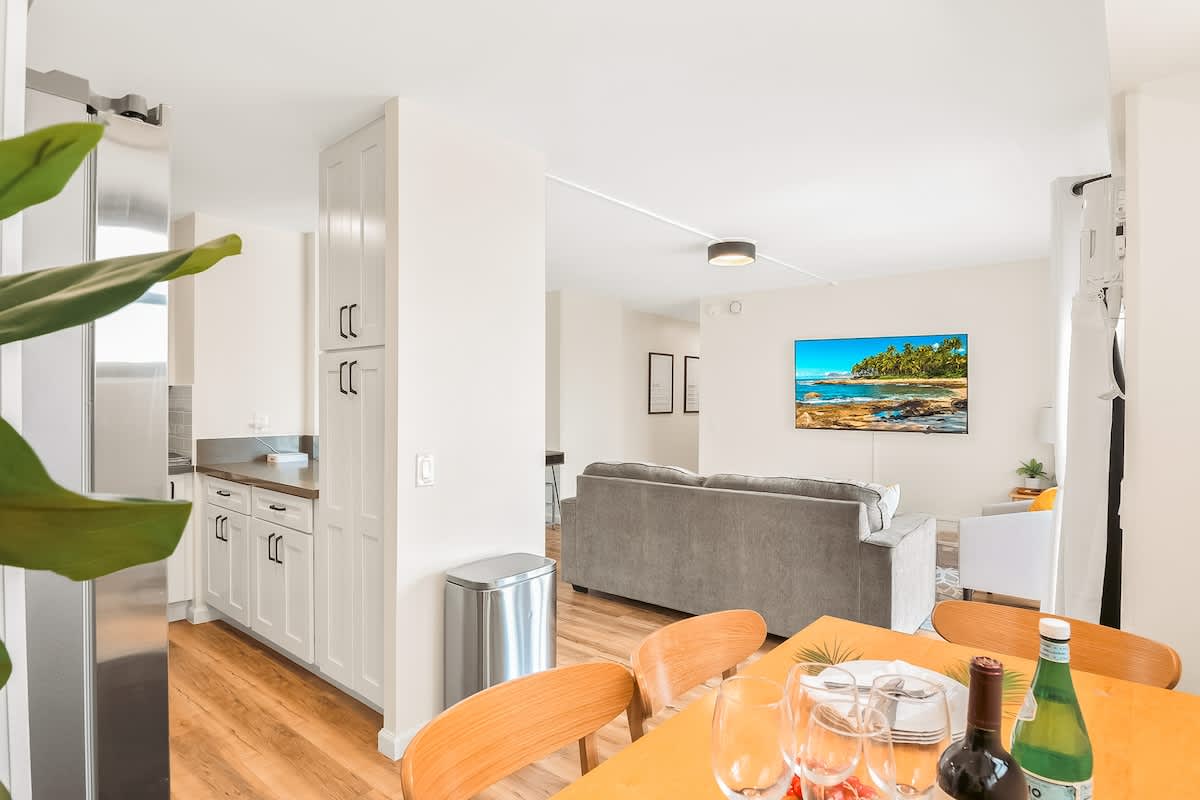 Unleash your culinary skills in the fully equipped kitchen, featuring top-notch appliances for delightful meals. Gather around the dining table for intimate meals or engaging conversations, seamlessly connected to the open-plan living space. Relax in the inviting living area, with a queen-size pull-out sleeper sofa prepared for you to unwind. Tune in to your favorite shows on the generously sized 75” Smart TV or simply enjoy the refreshing coolness of the air-conditioned surroundings. Enjoy the convenience of two bathrooms, with one located in the master bedroom for added privacy, and another accessible from both the living area and the second bedroom.