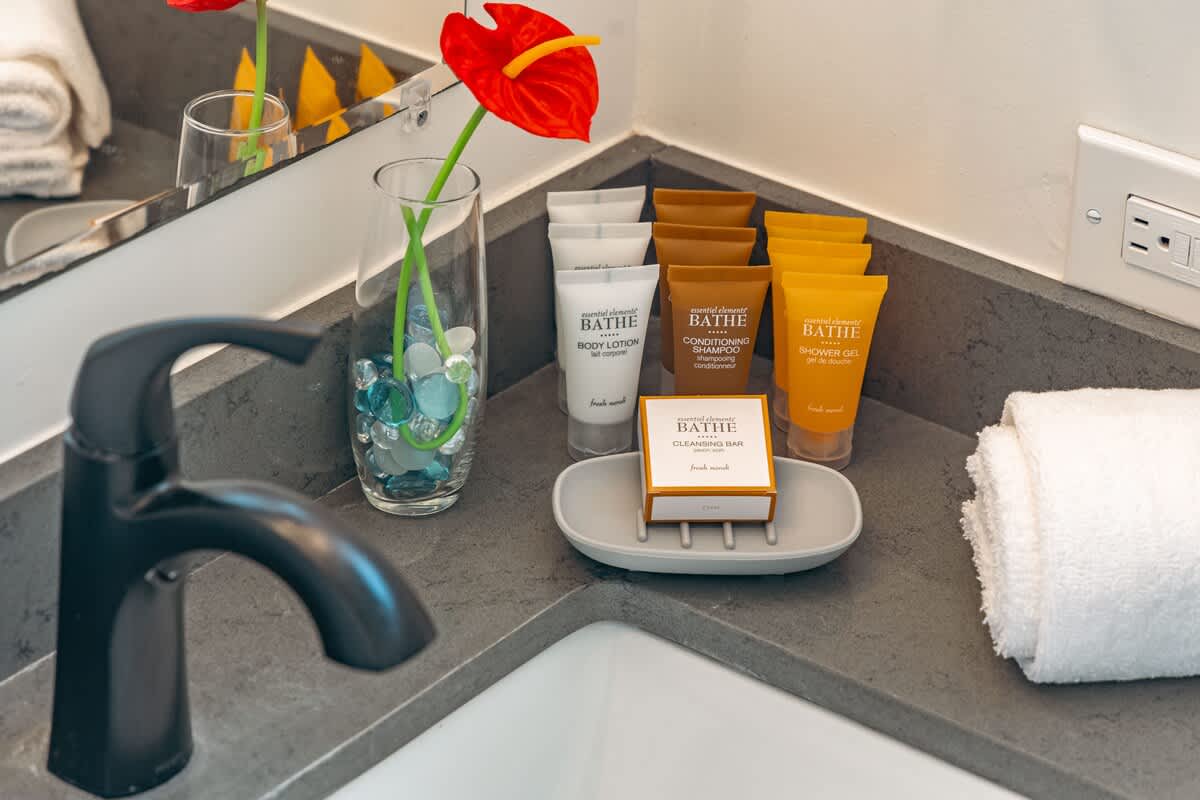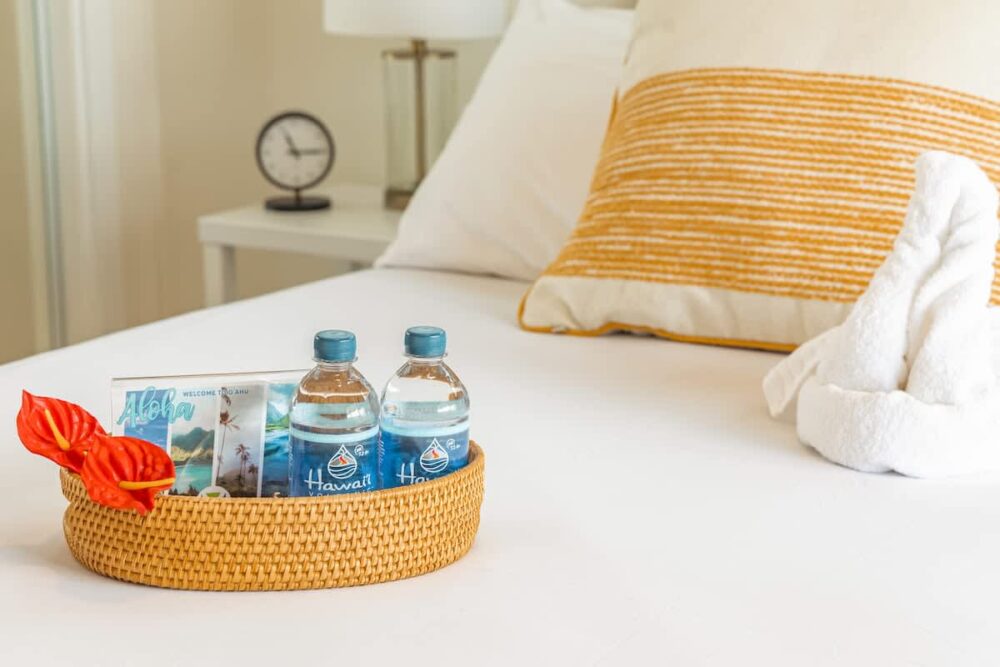 – Your very own Aloha Pack: coffee filters, salt and pepper, laundry detergent, dish soap and sponge, hand soap, shampoo/body wash/lotion set, toilet paper, paper towels, tissues, and cleaning supplies.