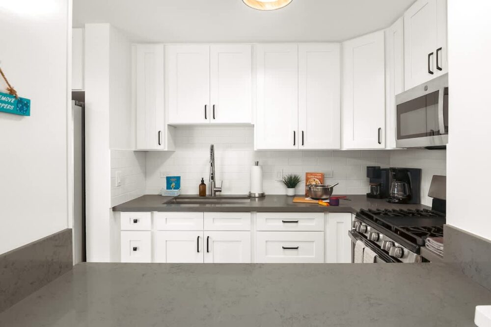 – Kitchen with full-size appliances: microwave, stove, oven, dishwasher, refrigerator with freezer.