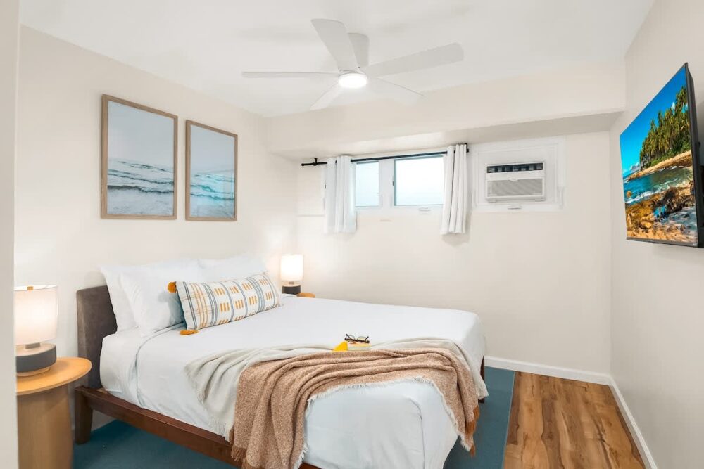 With 1000 square ft, it has 2 bedrooms and 2 private lanais, accommodating up to 6 guests comfortably, you’ll find relaxation at every turn. Sink into the plush king-size bed in the master suite, equipped with a 43” Smart TV for entertainment. The second bedroom boasts a cozy queen-size bed and 43” Smart TV as well ensuring everyone’s contentment.