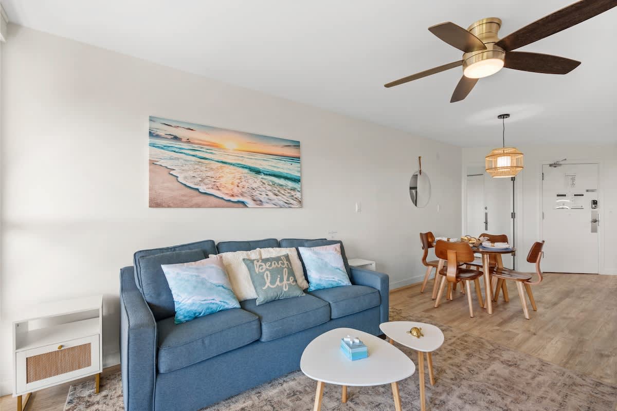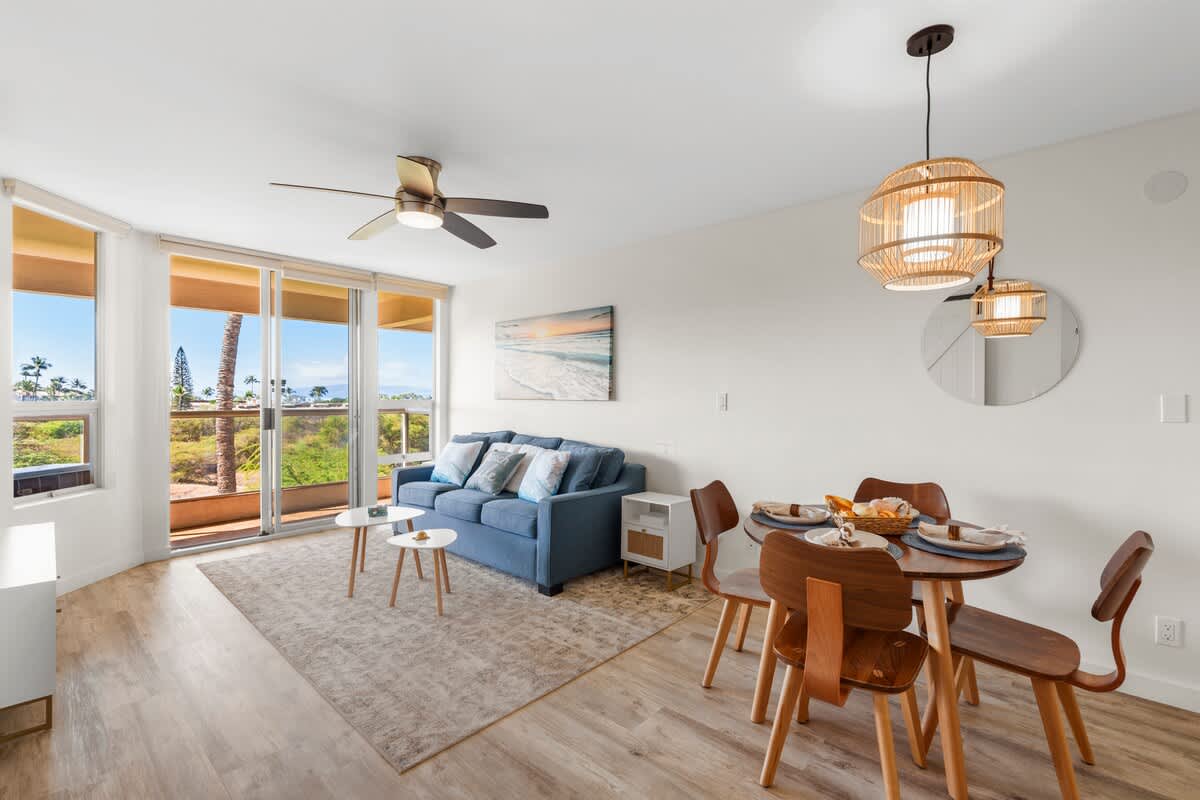 Escape to this beautiful top-floor Maui Banyan retreat, where modern comfort meets the beauty of Maui’s partial ocean views and year-round sunsets. This 1-bedroom, 1-bath retreat features high-end finishes, quartzite countertops, stainless steel appliances, and elegant furnishings. Enjoy the private lanai, free WiFi, Parking, and in-unit washer/dryer. The adjoining studio can be booked together for a 2-bedroom setup. Ideally located across from Kamaole II Beach Park, you’re steps from beaches, dining, and shops, with a resort-style pool, hot tubs, tennis courts, and BBQ areas for the perfect Maui escape.