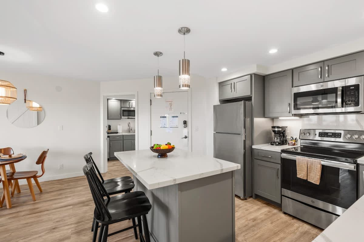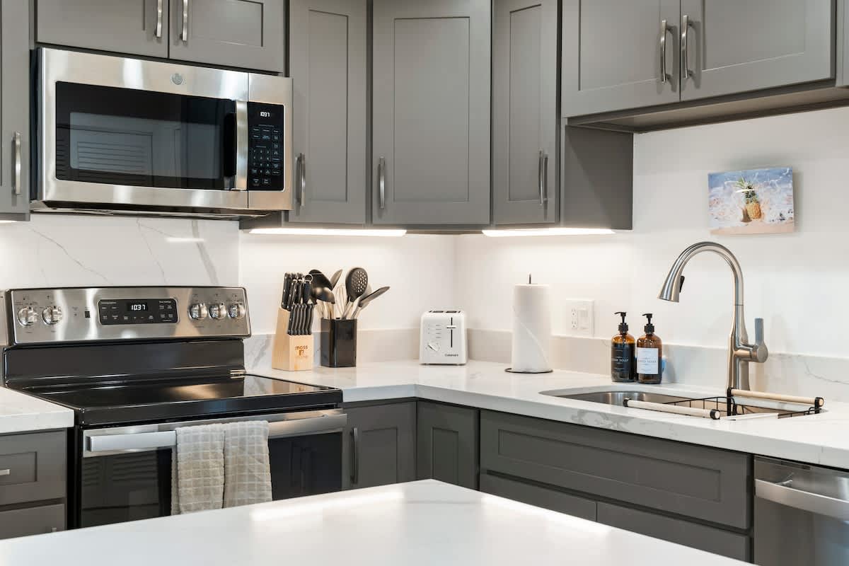 – Full kitchen with stainless steel, full-size appliances: stove, microwave with range hood, refrigerator with freezer, and dishwasher