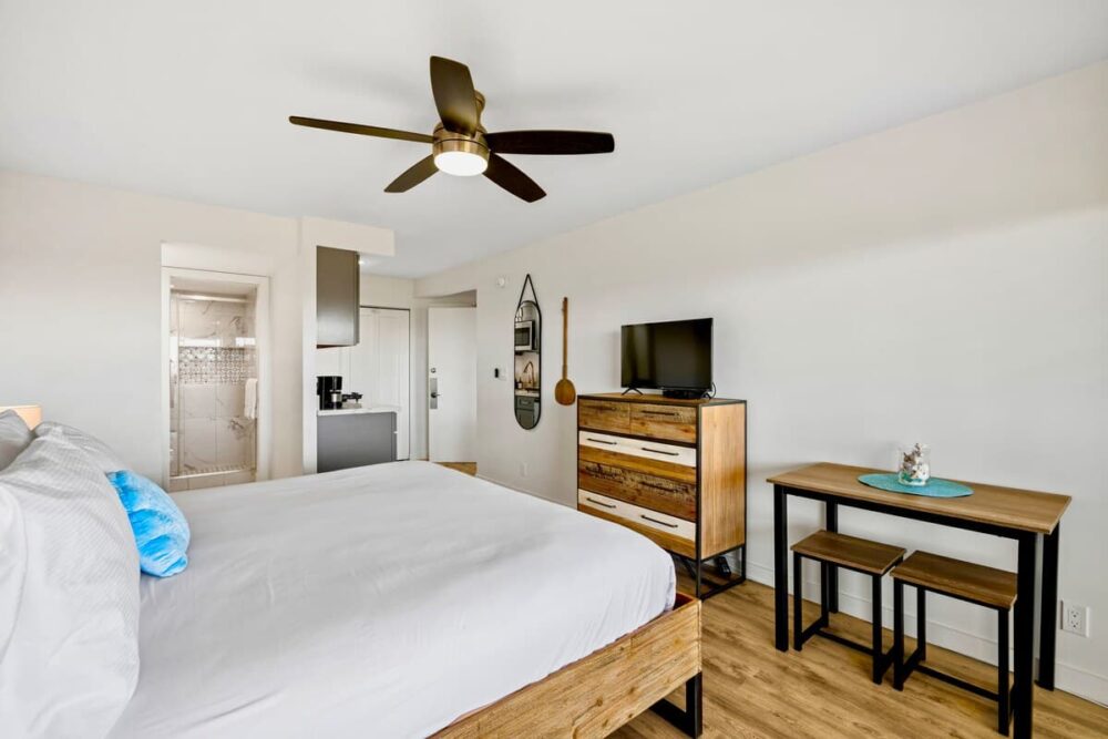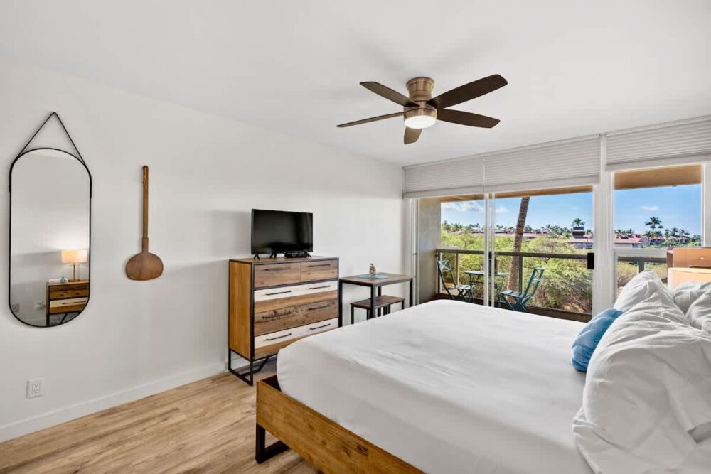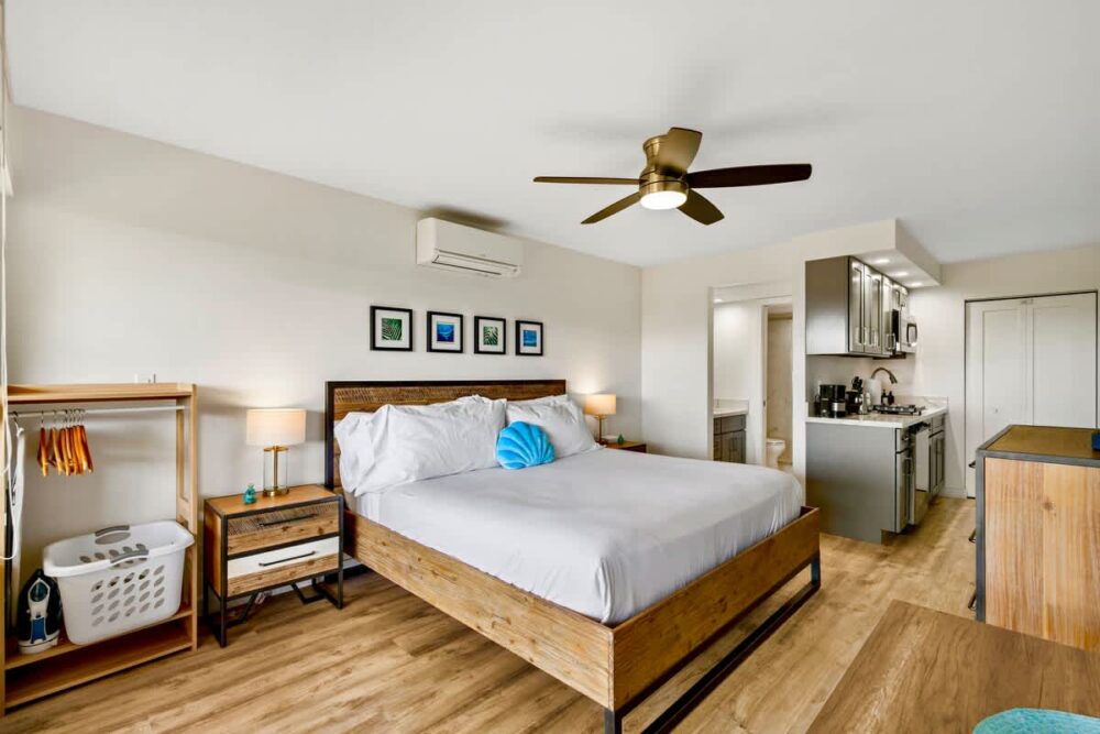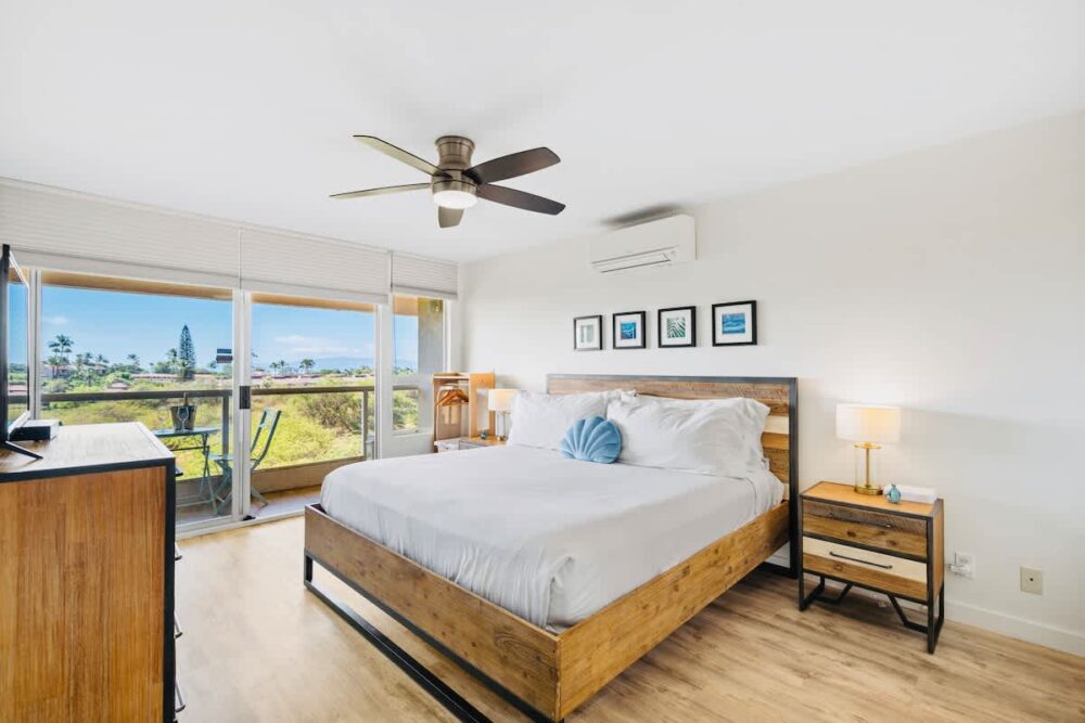 Enjoy your Maui getaway in this top-floor Maui Banyan studio featuring ocean views from your private lanai, a cozy king bed, 32″ Smart TV, split AC, ceiling fan, kitchenette, and walk-in shower. Guests can also book the adjoining 1-bedroom unit if extra space is needed, creating a spacious 2-bedroom retreat. With free Wi-Fi, parking, pool, hot tubs, tennis courts, and BBQ areas, plus a prime location across from Kamaole II Beach Park and steps from dining and shops, this studio offers the perfect mix of comfort, convenience, and island charm.
