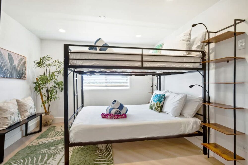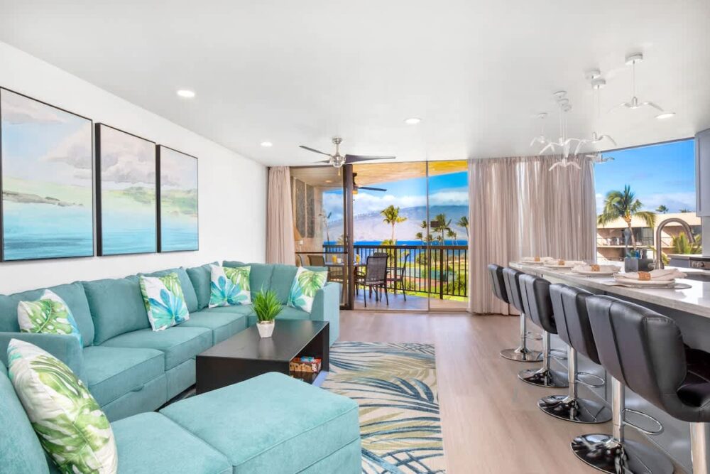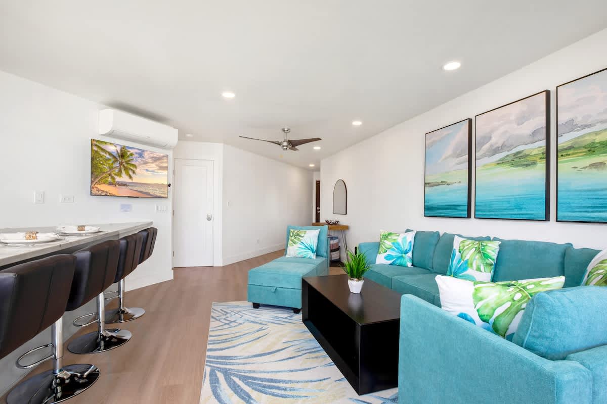 Maui Sunset offers a bright and breezy, fully renovated 5th-floor ocean-view 2BR/2BA retreat perfectly situated right on the beach, in the heart of Kihei, just steps from beautiful beaches, coastal walking paths, local shops, and great dining options. This spacious condo features a queen bed, two queen bunk beds, two walk-in showers, an in-unit washer and dryer, split AC in both bedrooms and the living room, a full kitchen with dishwasher, a comfortable sectional sofa, and a 50″ smart TV. With free Wi-Fi, free parking, and stunning sunset views from an oceanfront property known for its expansive lawn and relaxing atmosphere, this home is the perfect blend of comfort, convenience, and Maui charm!