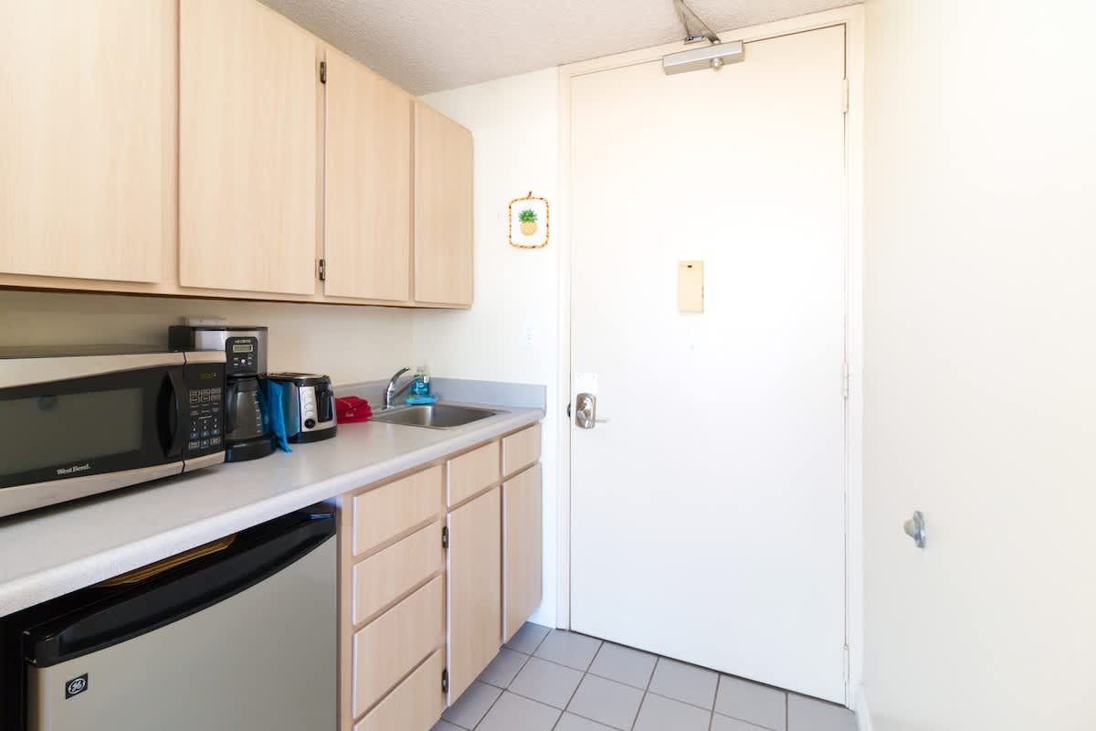 For your convenience and comfort, this air-conditioned unit has an open floor plan with a kitchenette that is equipped with a mini-fridge, 2-burner stovetop, microwave, coffee maker, toaster, dishes, silverware, and cooking utensils. The room has 1 queen-size bed, a pull-out sleeper sofa, and a flat-screen TV with cable. There is also a dining table and 4 chairs. The full bathroom comes with a bathtub & shower. Additionally, this unit has a step-out lanai (balcony) where you can enjoy the beautiful views!