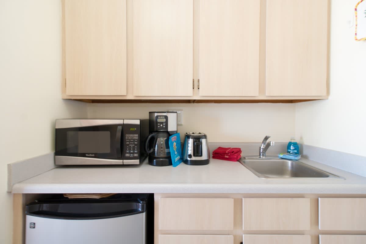 – Kitchenette with mini-fridge, 2-burner stovetop, microwave.