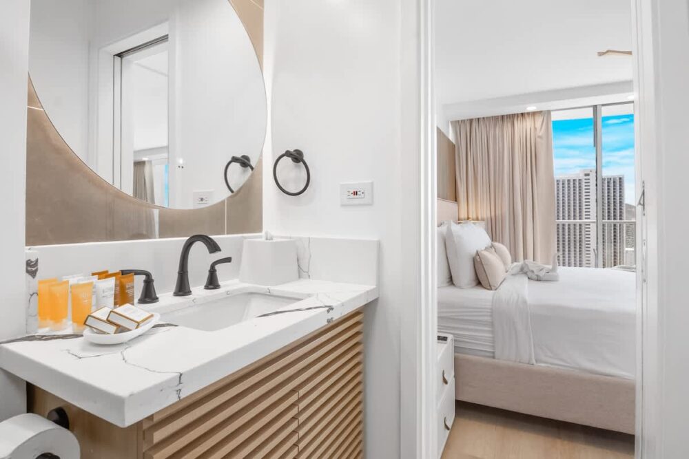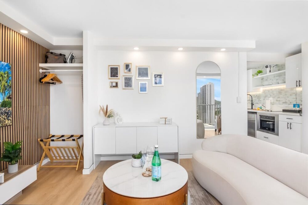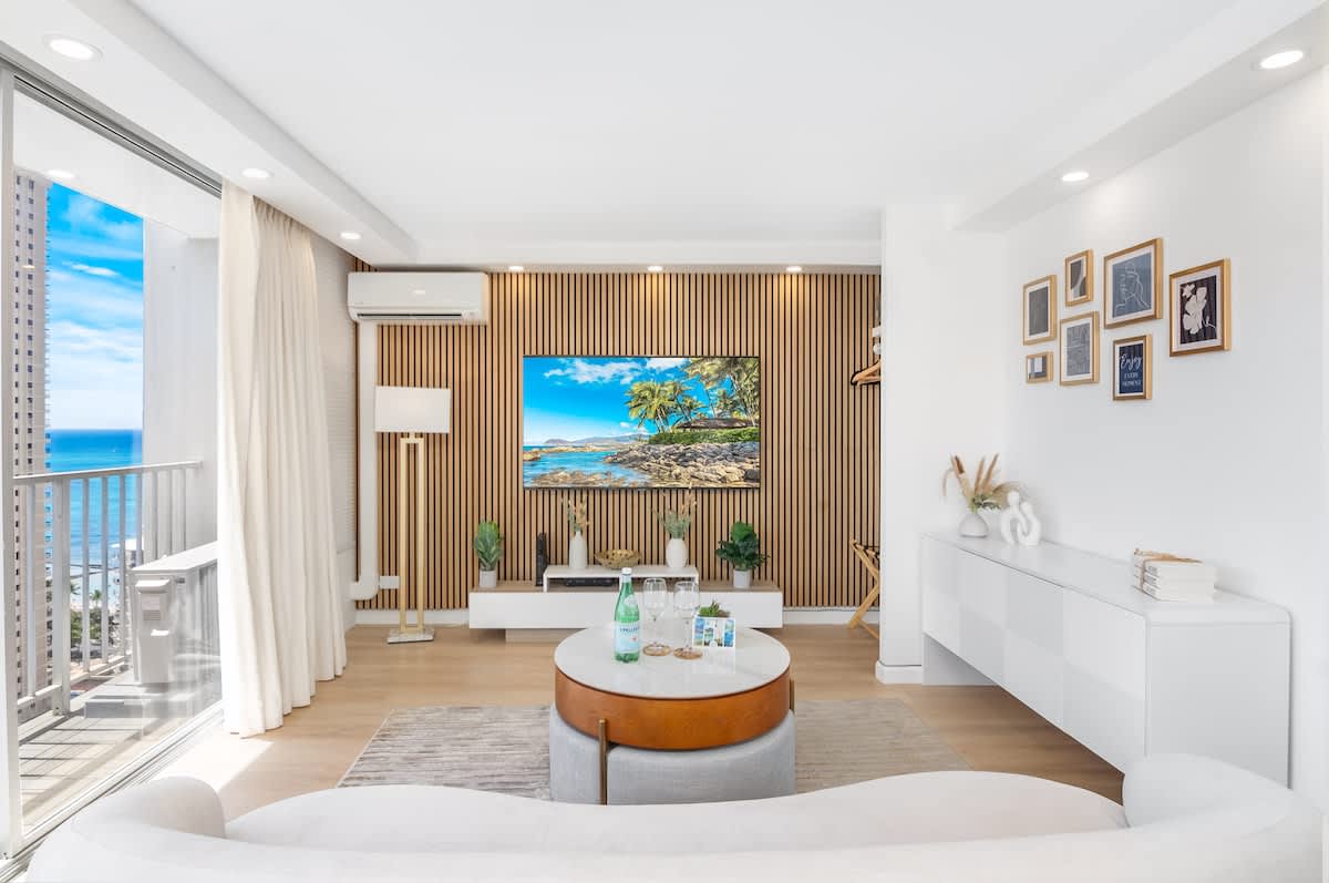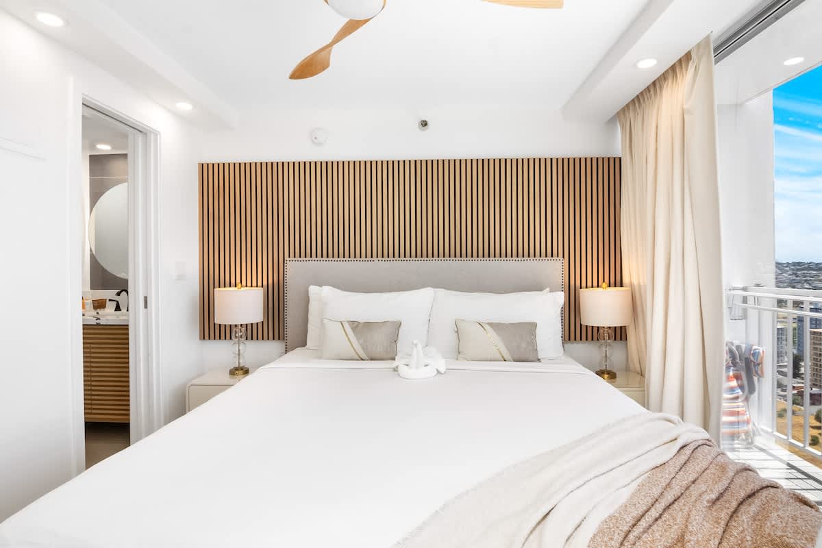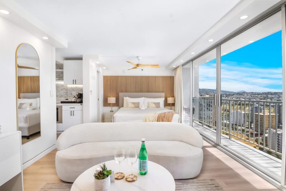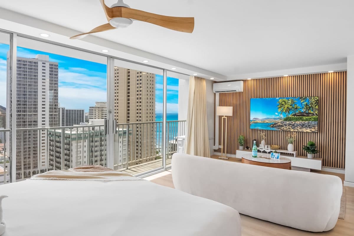 Discover comfort and charm in our newly remodeled Honeymoon Luxury Suite on the 25th-floor condo at the Pacific Monarch. Take in breathtaking ocean views and catch a glimpse of the Diamond Head. Take a rest on a king-size bed, plus split AC, and unwind with a cinematic experience on the 65″ Smart TV. Don’t forget to indulge in the rooftop pool, offering mesmerizing ocean and city views. Just a short 700-foot stroll to Waikiki Beach, conveniently located one block from Duke’s Statue!
