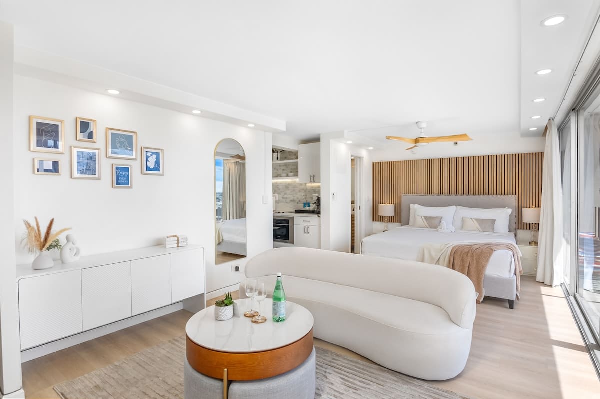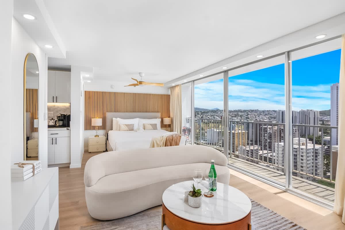 Step into paradise with our beautifully remodeled Honeymoon Luxury Suite on the 25th-floor studio, offering mesmerizing east-facing views of the ocean that defy description. Nestled in the heart of historic Waikiki within the Pacific Monarch, this inviting unit comfortably accommodates up to 2 guests.
