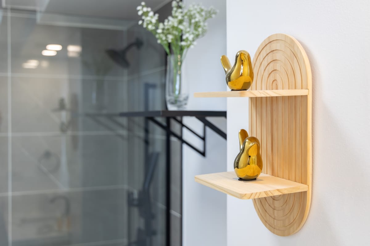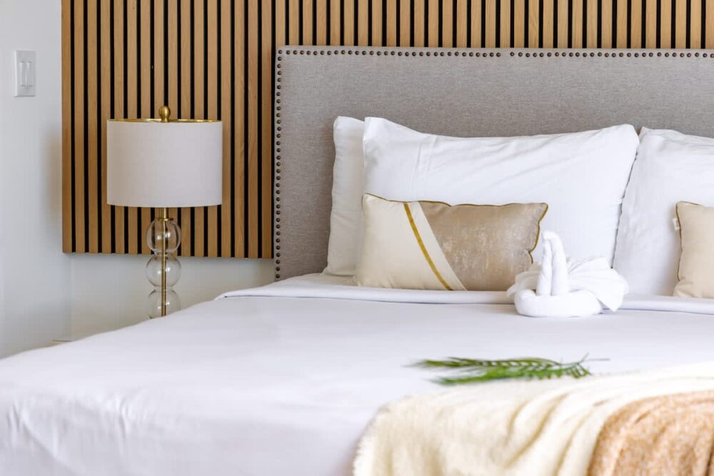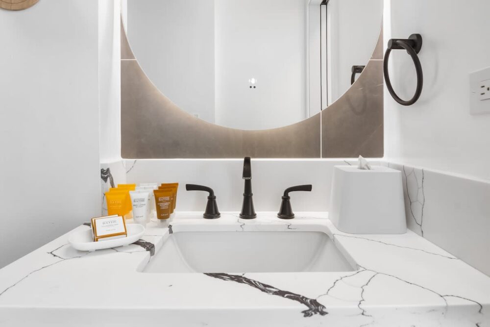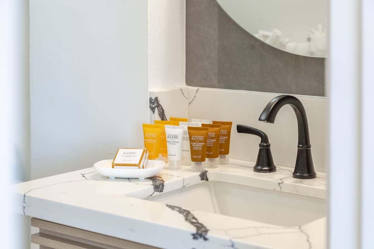 Our brand-new California king-size mattress, The Dream Cloud Premier Rest with a deluxe Pillow Top is the thickest, cushiest mattress with 8-layer construction for the pinnacle of comfort. Made with CertiPUR-US® certified foams. Additionally, the full bathroom is designed with a walk-in shower, complete with a handheld shower wand.