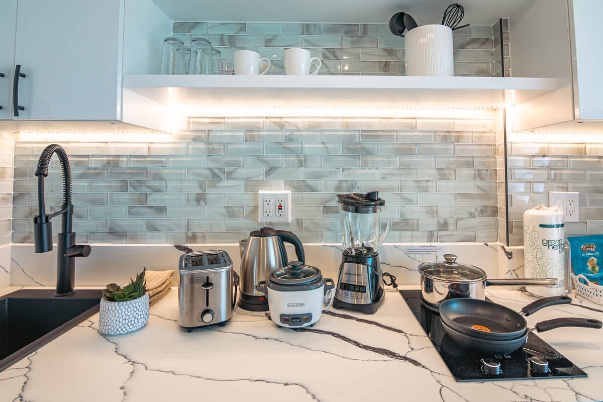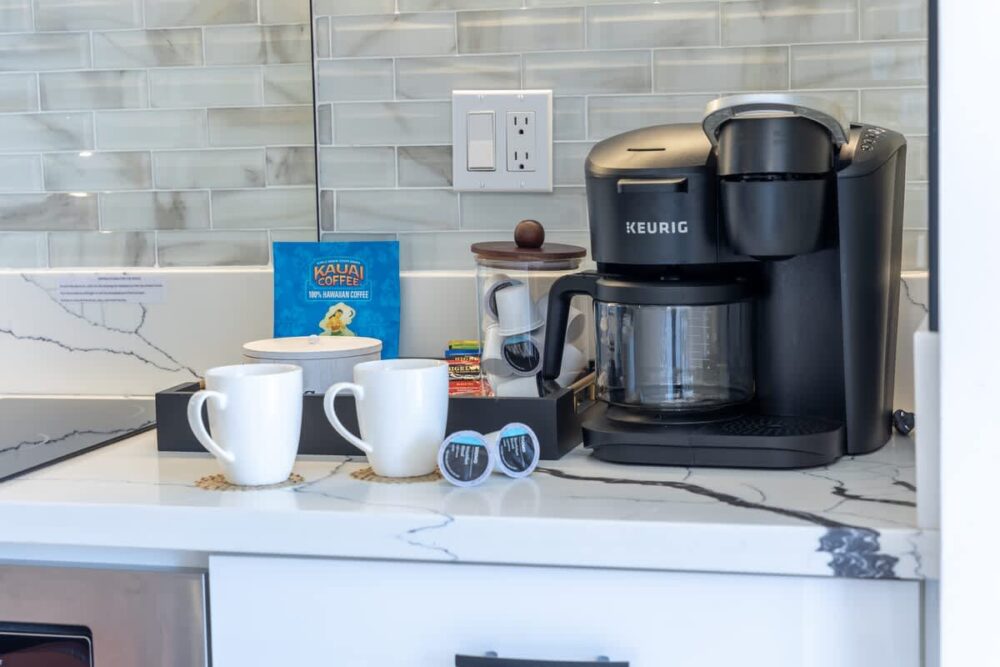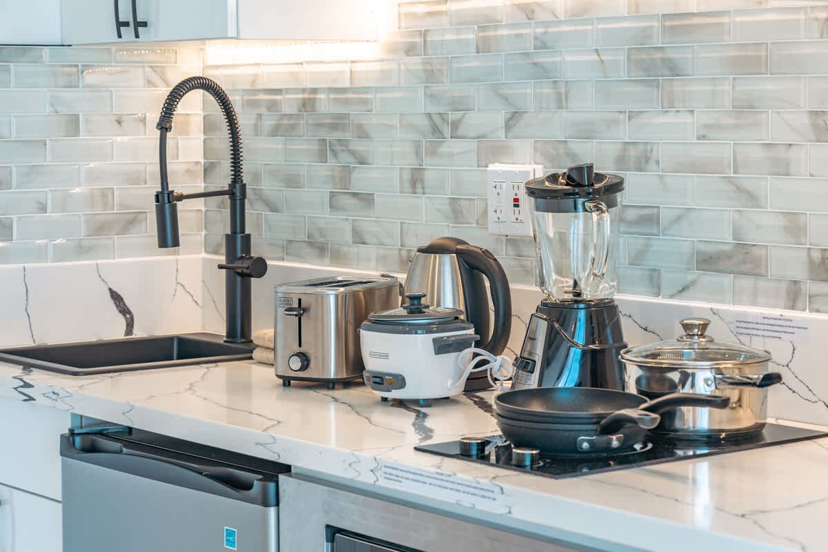 – Equipped with Keurig and drip coffee maker, toaster, dishes, silverware, and cooking utensils.