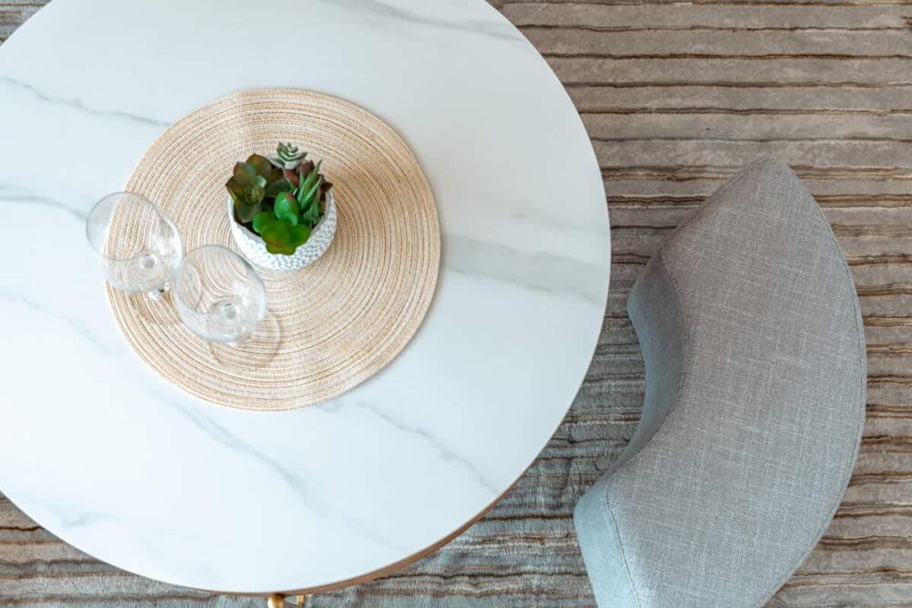 – Lift-top round coffee table with 3 Ramie fabric stools