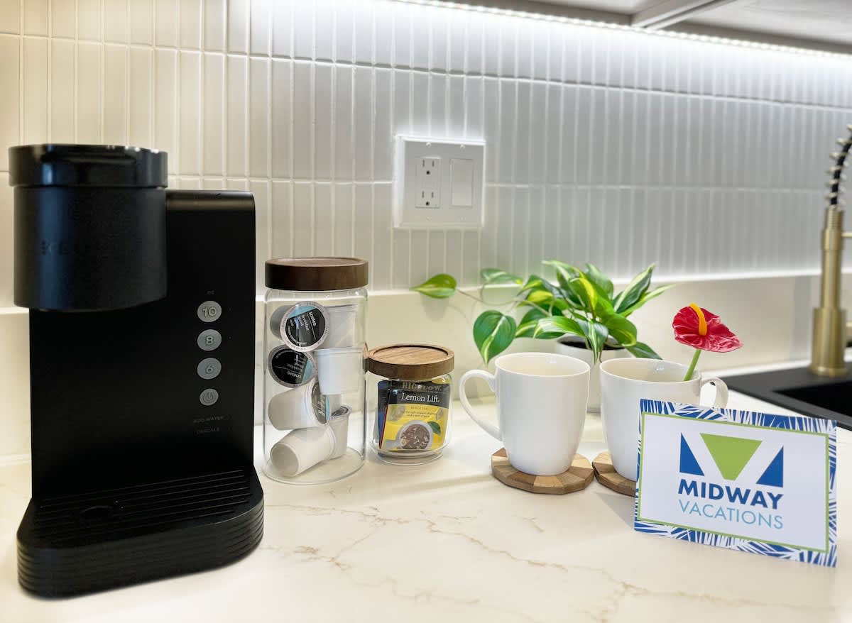 – Equipped with a Keurig coffee maker, toaster, kettle, blender, rice cooker, dishes, silverware, and cooking utensils.