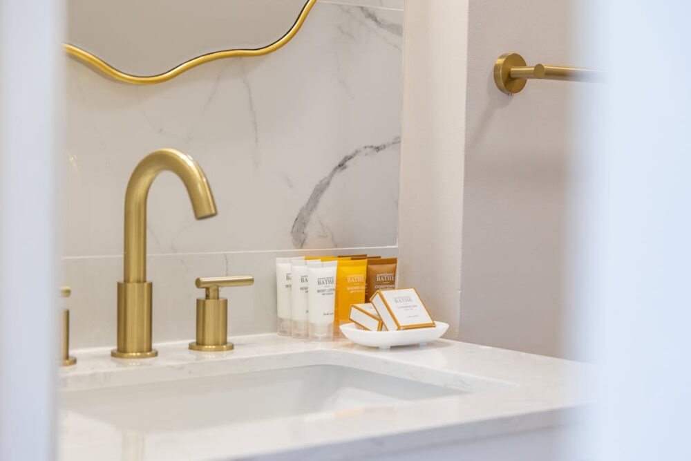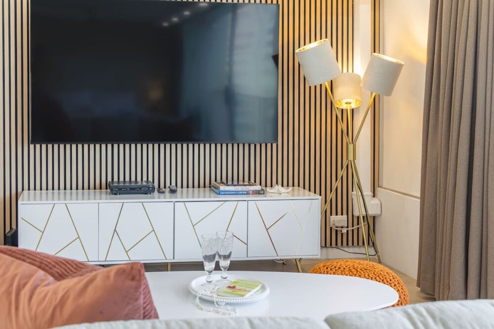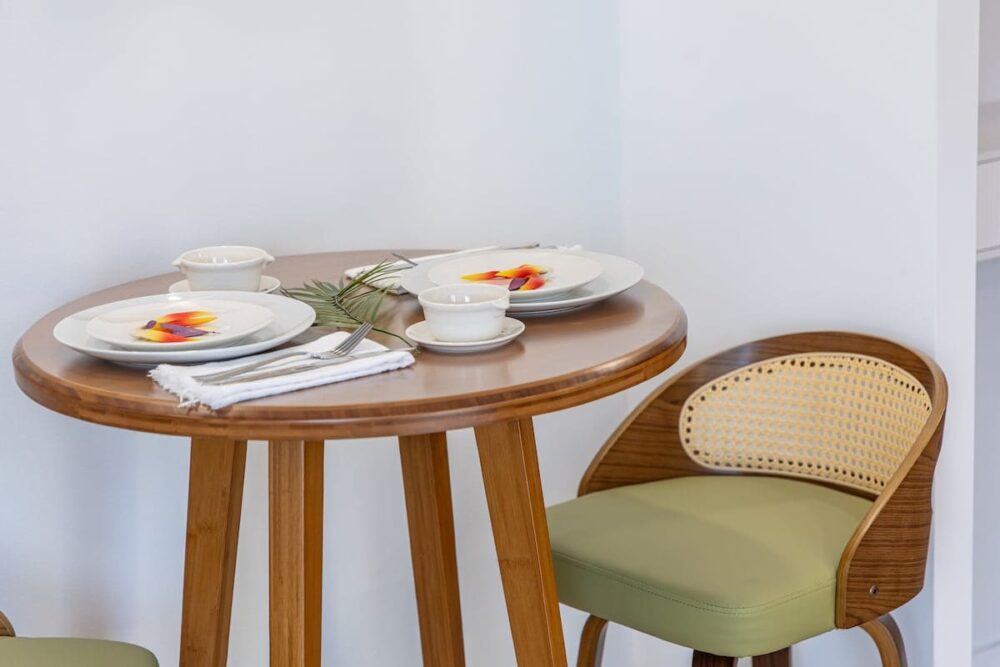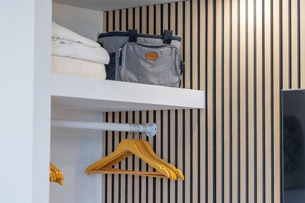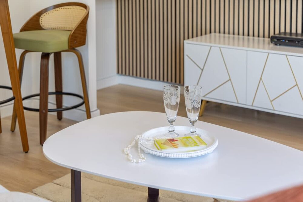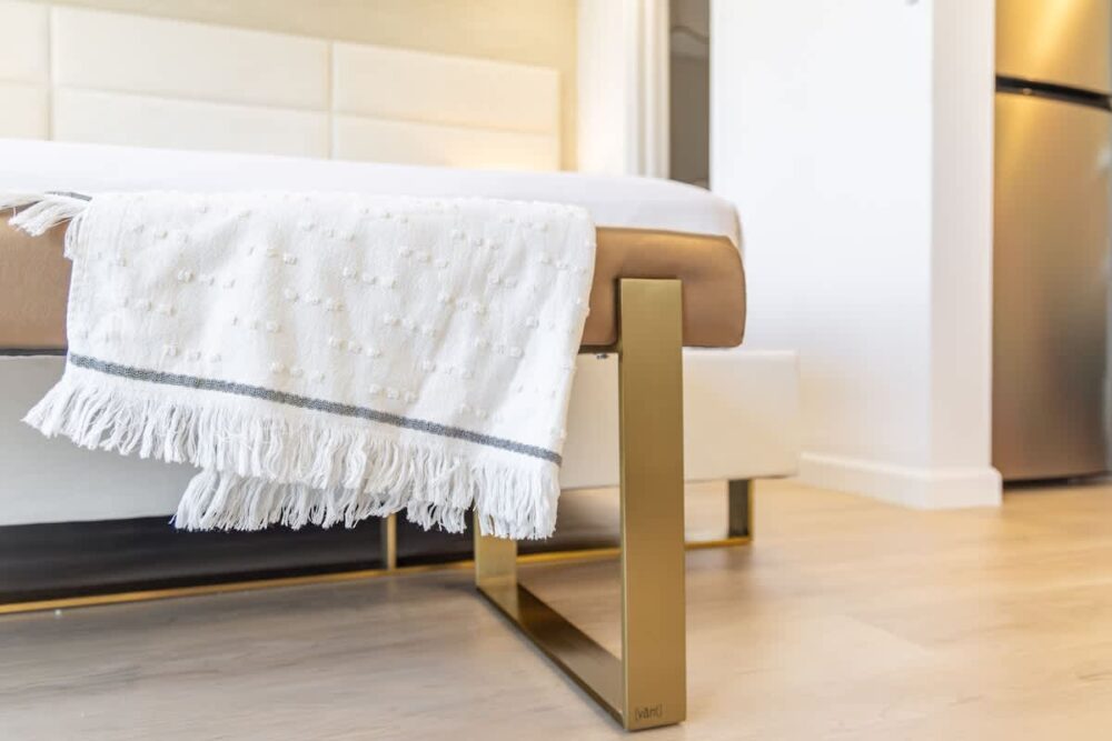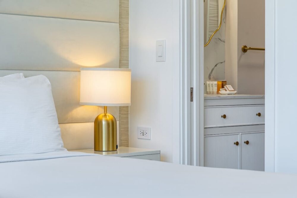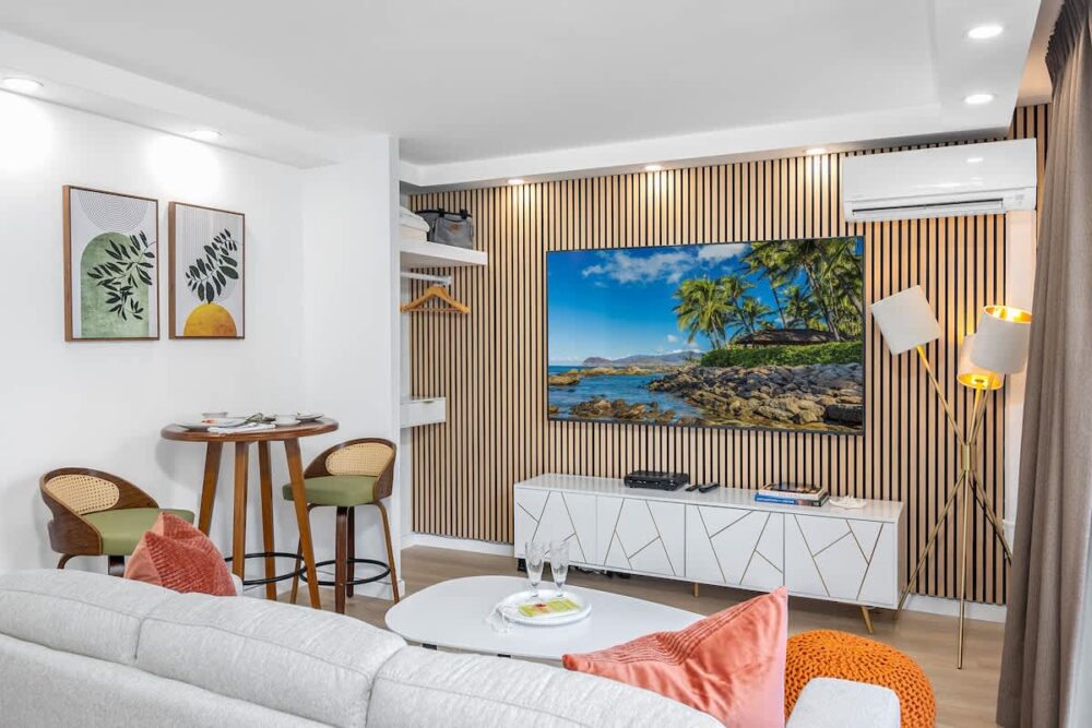 Inside, we’ve got you covered with a handy split air-conditioning unit to keep you cool and comfy. The open layout includes a kitchenette with all the essentials: a full-size refrigerator, a double burner hot plate, microwave, Keurig coffee maker, toaster, blender, kettle, dishes, silverware, and cooking utensils. And speaking of A/C, we’ve upgraded to a super-quiet Split A/C unit for your ultimate comfort – no noisy window units here! The room has a Vant Elevated Platform Bed – California King Size with Beautyrest Pressure smart™ 2.0 Plush 11.75″ Mattress, one new regular sofa, and a cool 75″ Samsung smart TV. You’ve also got free high-speed wireless internet, a dining table for 2, and a ceiling fan to keep things cool.
