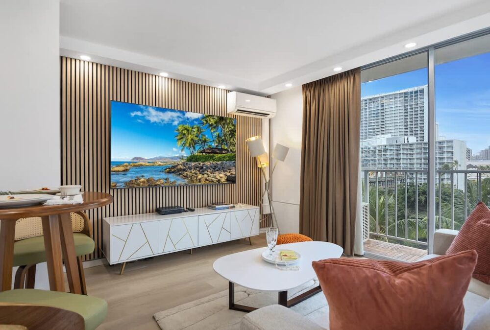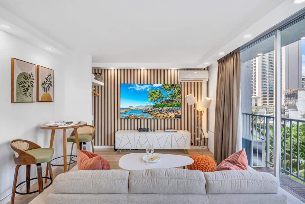Experience a newly renovated studio on the 8th floor of the Pacific Monarch! Enjoy the comfort of a peaceful split AC, a new Vant Elevated Platform Bed California King-size with a Beautyrest Pressure smart™ 2.0 Plush 11.75″ Mattress Cal King, and a 75″ Samsung smart TV. Take in the amazing views of the ocean and city from the rooftop pool area. Plus, we’re just 700 feet from Waikiki Beach, and Duke’s Statue is only a block away!