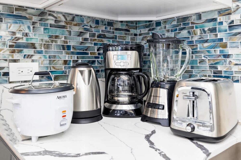 – Fully equipped with a toaster, coffee maker, rice cooker, blender, kettle, pots, pans, silverware, cookware, and dishes.