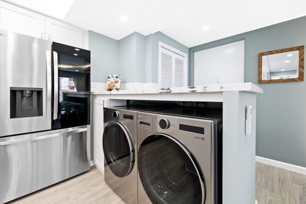 – Kitchen with full-size appliances: microwave, stove, oven, dishwasher, refrigerator with freezer, washer, and dryer