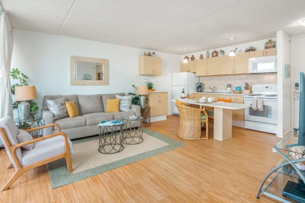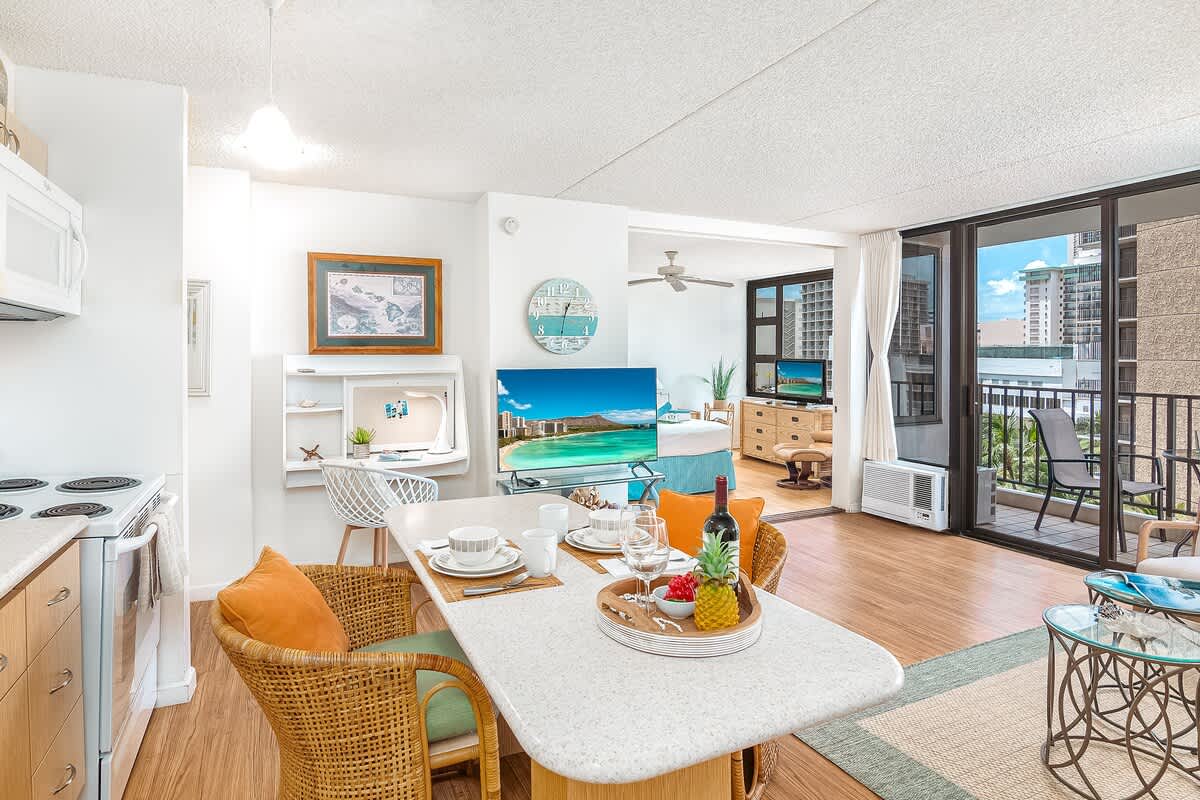 Welcome to your slice of paradise at the family-friendly Waikiki Banyan (Tower 1), just a block from world-famous Waikiki Beach. This cozy 600 sq ft, 10th-floor, west-facing condo offers partial ocean and city views from your private lanai and features an air-conditioned open layout with a fully equipped kitchen and dining for two. With a queen bed, sleeper sofa, full bathroom, 50″ Smart TV, plus free Wi-Fi and parking, it’s the perfect home base for a relaxing Waikiki getaway!