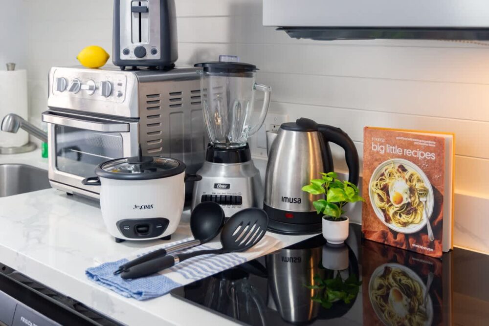 – Fully equipped with a toaster, coffee maker, rice cooker, blender, kettle, pots, pans, silverware, cookware, and dishes.