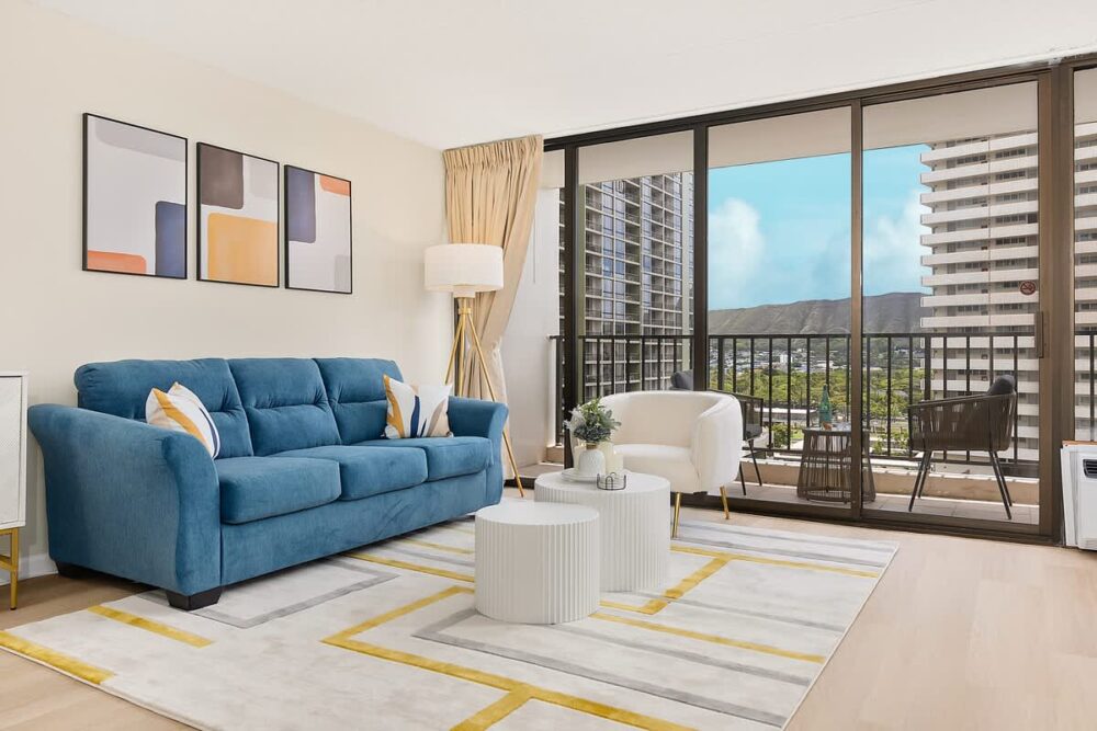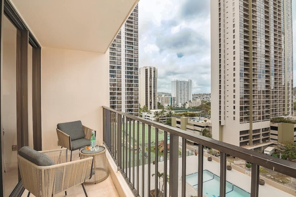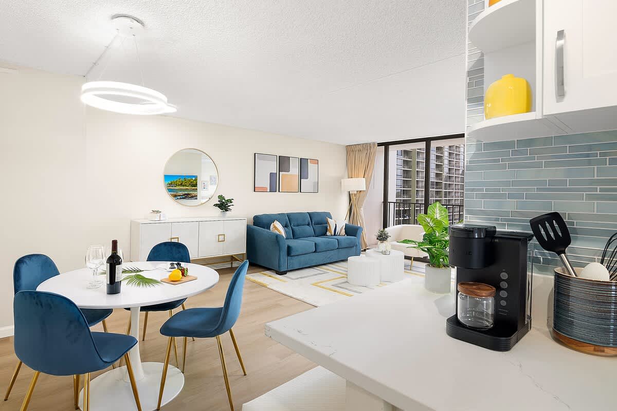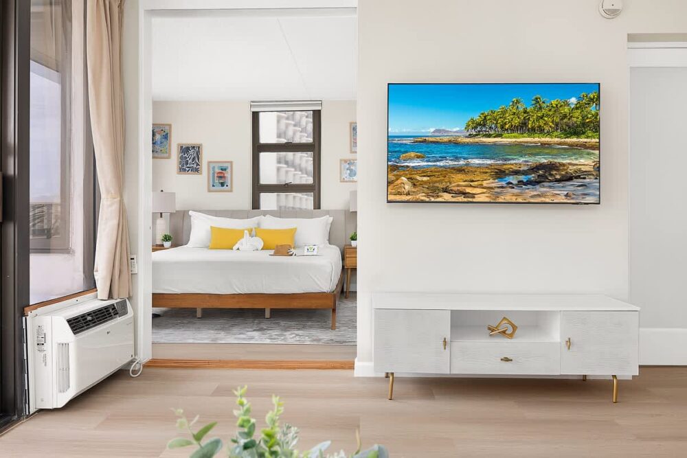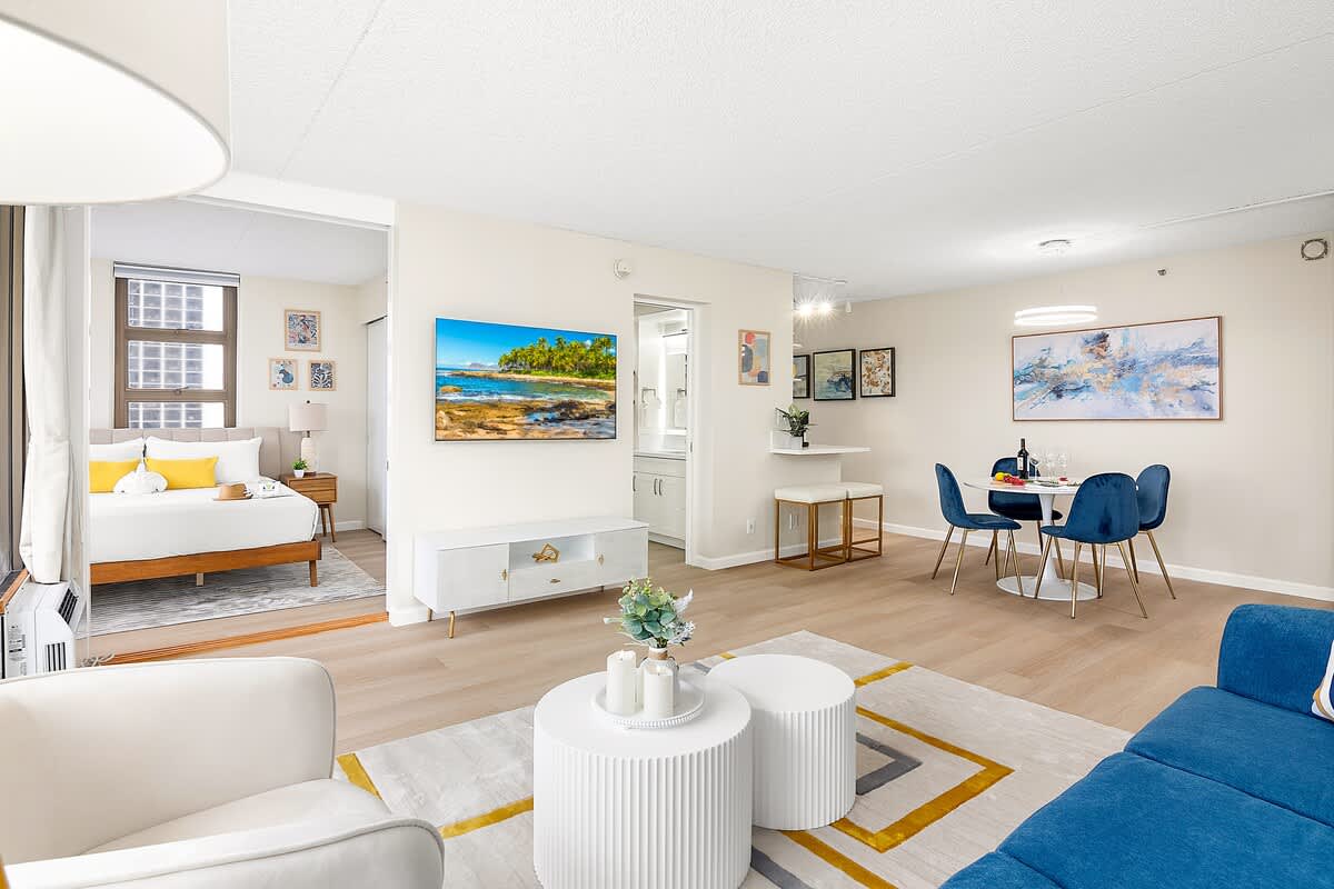 Immerse yourself in the beauty of Waikiki from this newly renovated condo in Waikiki Banyan (Tower 1- Makai). Located just a short stroll from the famous waves, this 11th-floor escape offers breathtaking mountain and city views. Savor the simplicity of home-cooked meals in the fully equipped kitchen and gather around the dining area with a dining table and 4 chairs for shared moments. Relax in the comfort of the plush king-size bed in the bedroom or the pull-out sleeper sofa in the living room, complete with a 55” Samsung Smart TV for entertainment. Step onto the Lanai to enjoy the stunning sunrise views or unwind with evening cocktails. And don’t miss the modern convenience of a full bathroom featuring a walk-in shower, adding a touch of luxury to your Hawaiian escape!