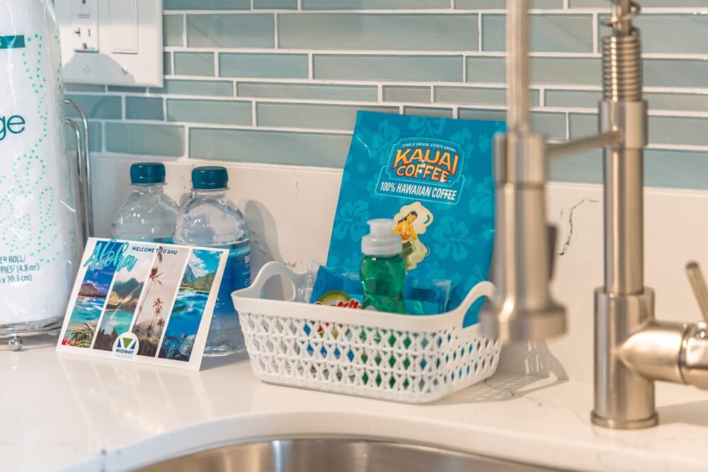 – Your very own Aloha Pack: coffee filters, salt and pepper, laundry detergent, dish soap and sponge, hand soap, shampoo/body wash/lotion set, toilet paper, paper towels, tissues, and cleaning supplies.