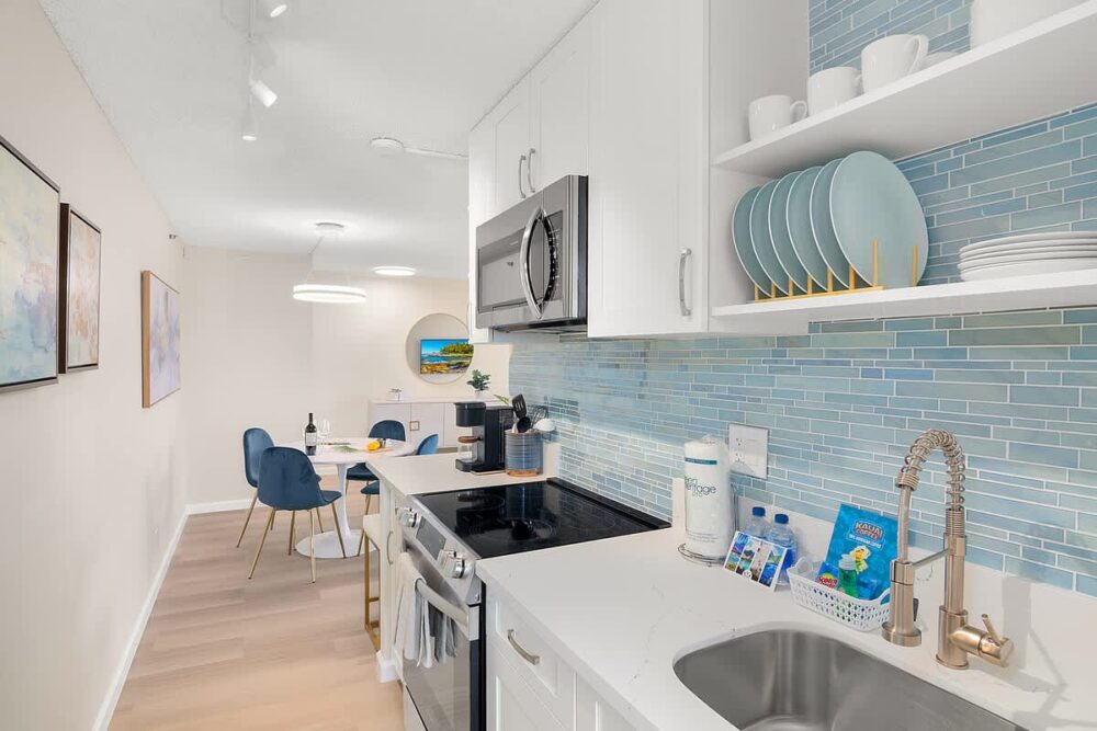 – Fully-equipped kitchen with full-size appliances: microwave/range-hood, stove, and refrigerator with freezer.