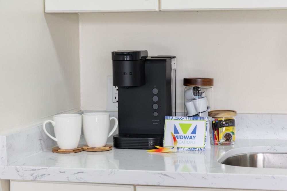 – Fully equipped with a toaster, coffee maker, rice cooker, blender, kettle, pots, pans, silverware, cookware, and dishes.