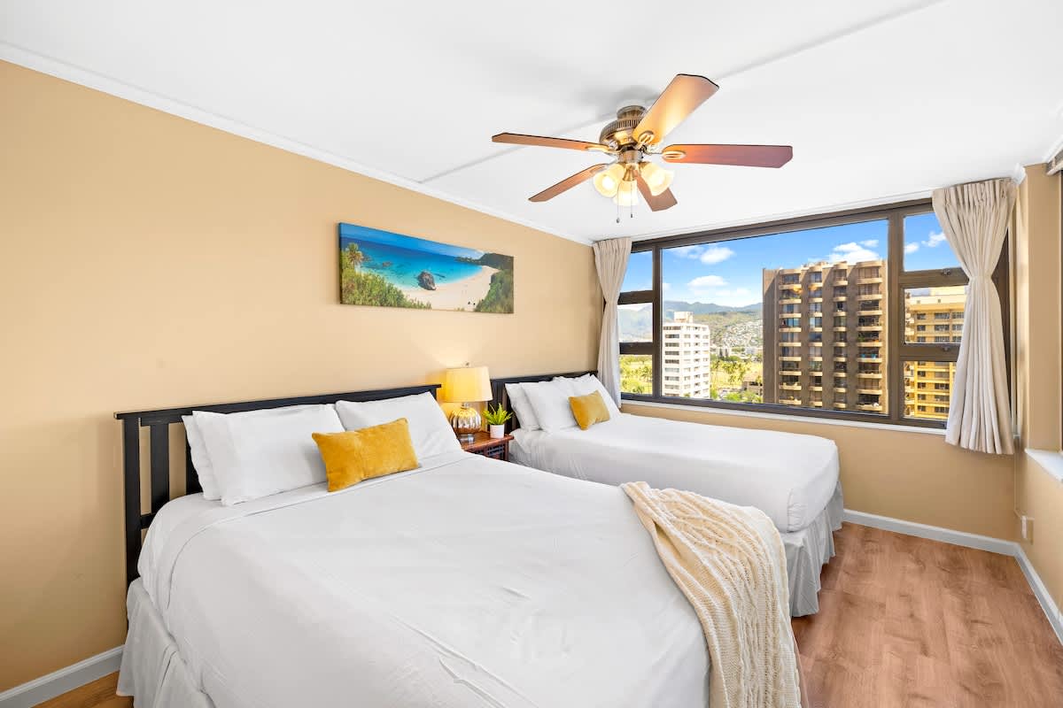 Experience paradise in this renovated 1-bedroom condo at the family-friendly Waikiki Banyan (Tower 2). Perfect for up to 4 guests, this 12th-floor retreat offers mountain and city views from the living room, bedroom, and a private lanai. This unit has a total area of 600 sq ft. Enjoy an open layout, air conditioning, a fully equipped kitchen, queen and full beds, a sleeper sofa, a 55″ TV, a modern bathroom, free WiFi, parking, and convenient on-floor laundry. Just a short walk to Waikiki Beach, shops, and dining!