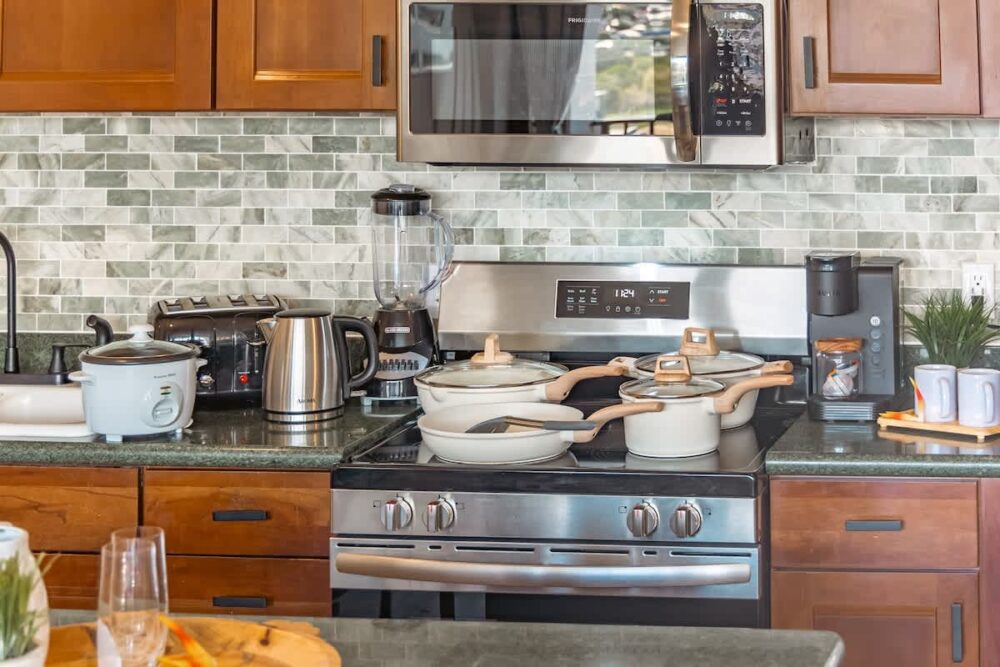 • Fully equipped with a toaster, coffee maker, rice cooker, blender, kettle, pots, pans, silverware, cookware, and dishes.