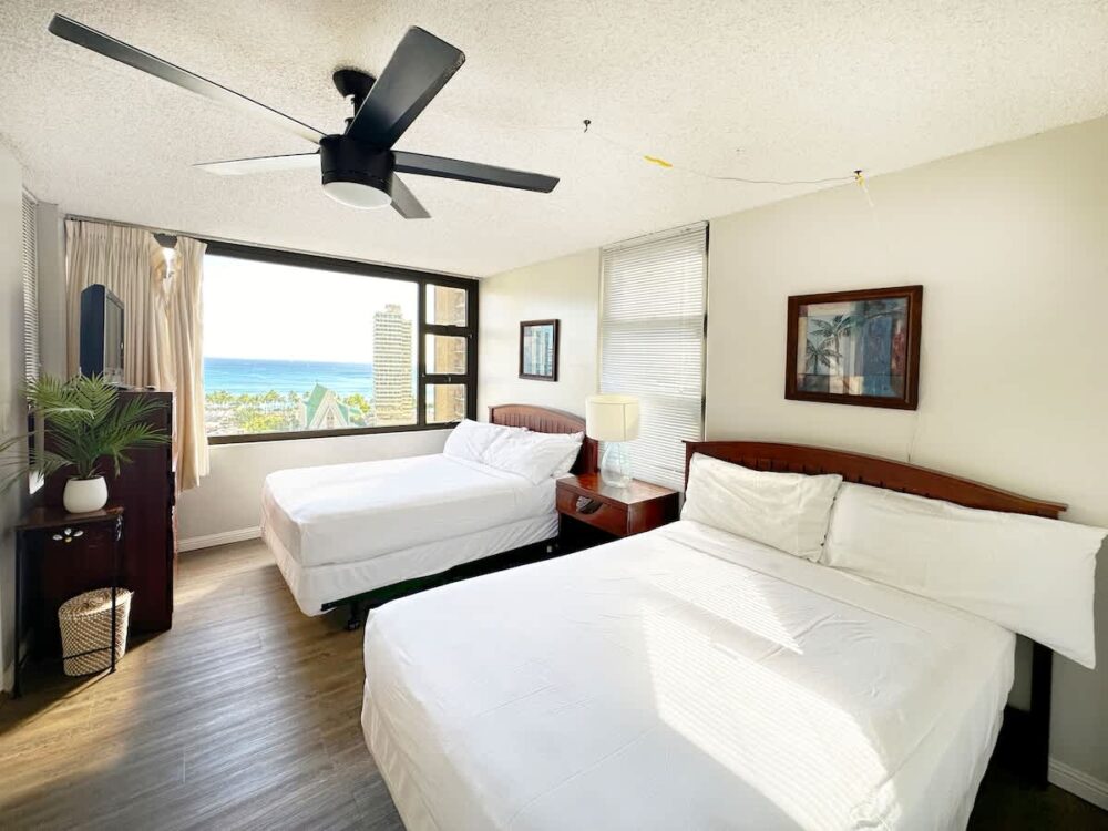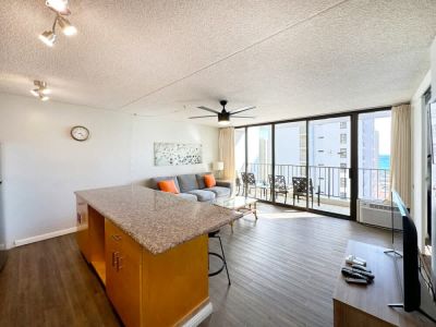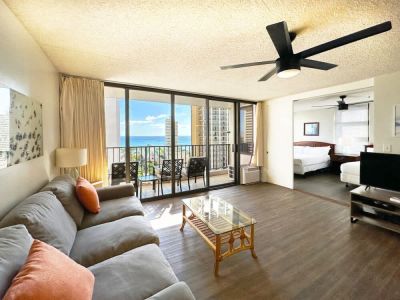 Stay in this inviting 600 sq ft 1-bedroom condo at Waikiki Banyan Tower 2 (Mauka), ideal for families or friends seeking a relaxing island escape. Enjoy ocean views from the balcony, living area, and bedroom, rest comfortably on two full beds or the sleeper sofa, and prepare meals in the fully equipped kitchen. With a smart TV, full bathroom with tub/shower combo, and a well-planned layout, this condo offers a welcoming home base for a memorable Waikiki stay!