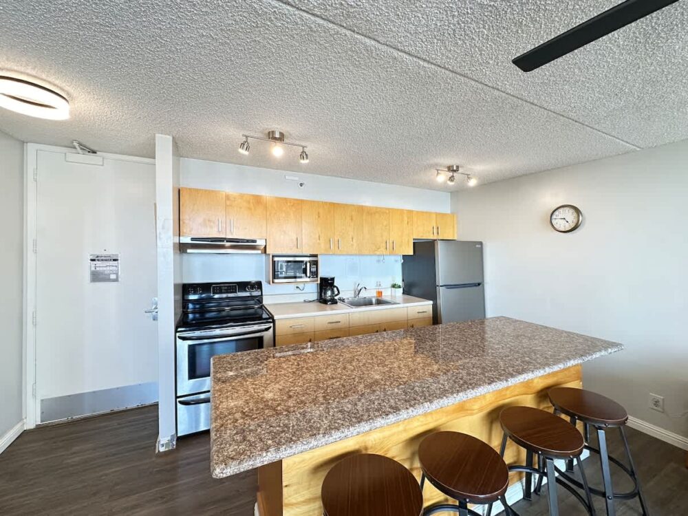 • Fully equipped with a toaster, coffee maker, rice cooker, blender, kettle, pots, pans, silverware, cookware, and dishes.