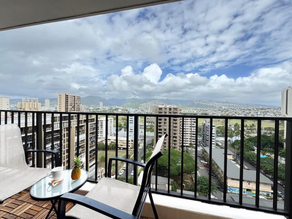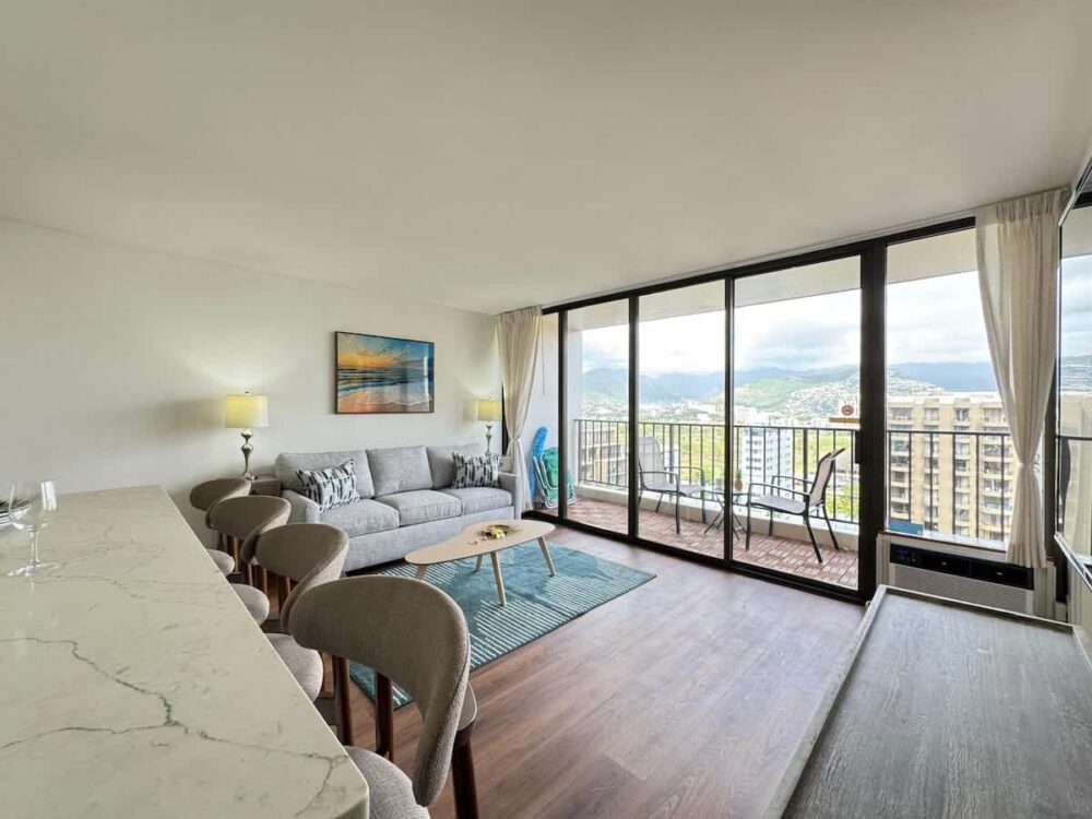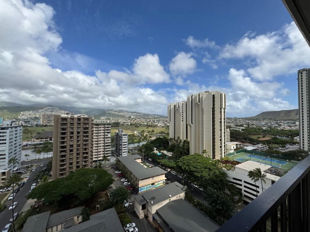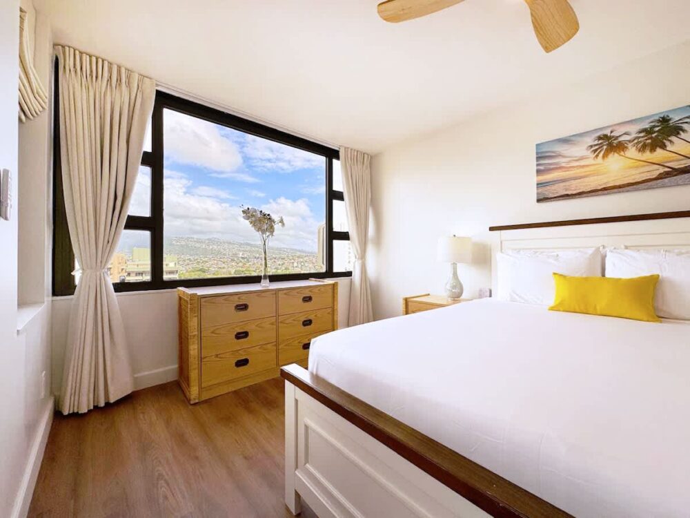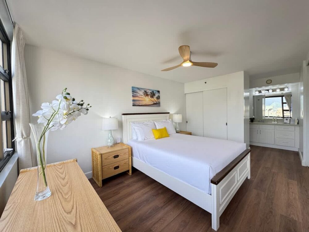 Step into this partially renovated 600 sq ft one-bedroom condo on the 18th floor of Waikiki Banyan and enjoy soothing mountain and city views that create a welcoming retreat after a day of island adventures. Just one block from world-famous Waikiki Beach, this inviting space places you within easy walking distance of dining, shopping, the Honolulu Zoo, and Kapiolani Park. The condo features a comfortable queen bed, window air conditioning, a 55-inch smart cable TV, free Wi Fi and parking, a full kitchen for easy home-style meals, and a bathroom with a tub and shower combo, making it a relaxing and convenient home base for your Waikiki getaway!